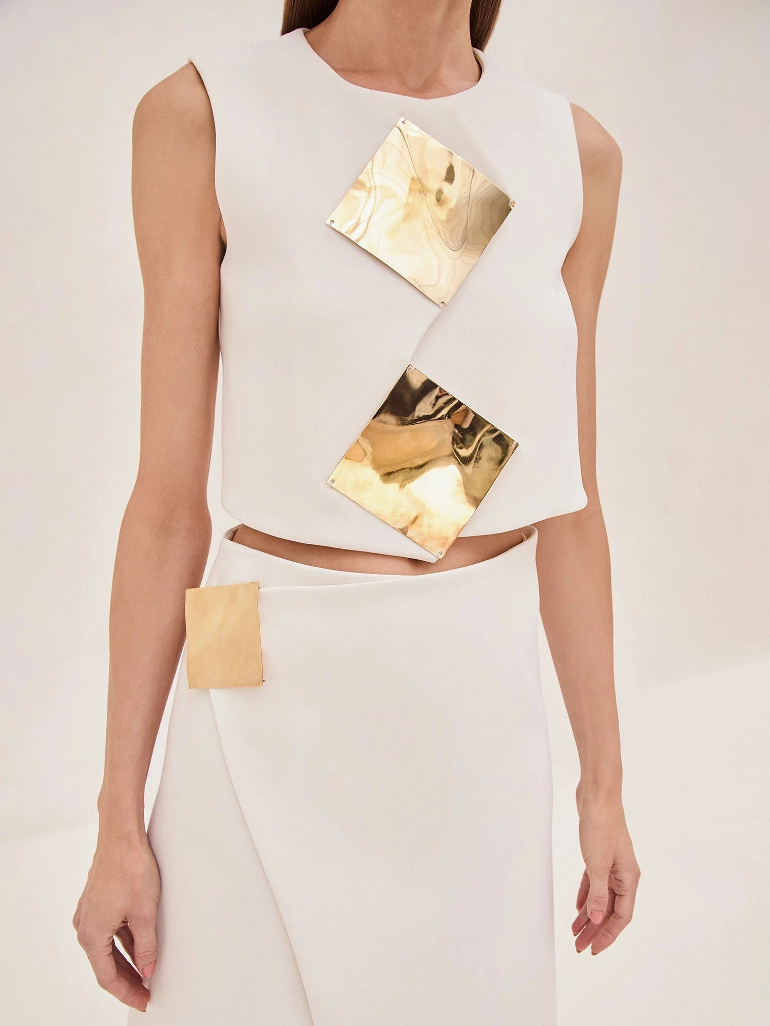 The Athens Top features a clean, structured silhouette, elevated by striking metallic geometric embellishments that add a contemporary flair. Designed to pair effortlessly with the Zilai Skirt, the Athens Top creates a cohesive and chic ensemble. The cropped length offers a flattering balance when styled with high-waisted pieces, making it versatile for various looks.