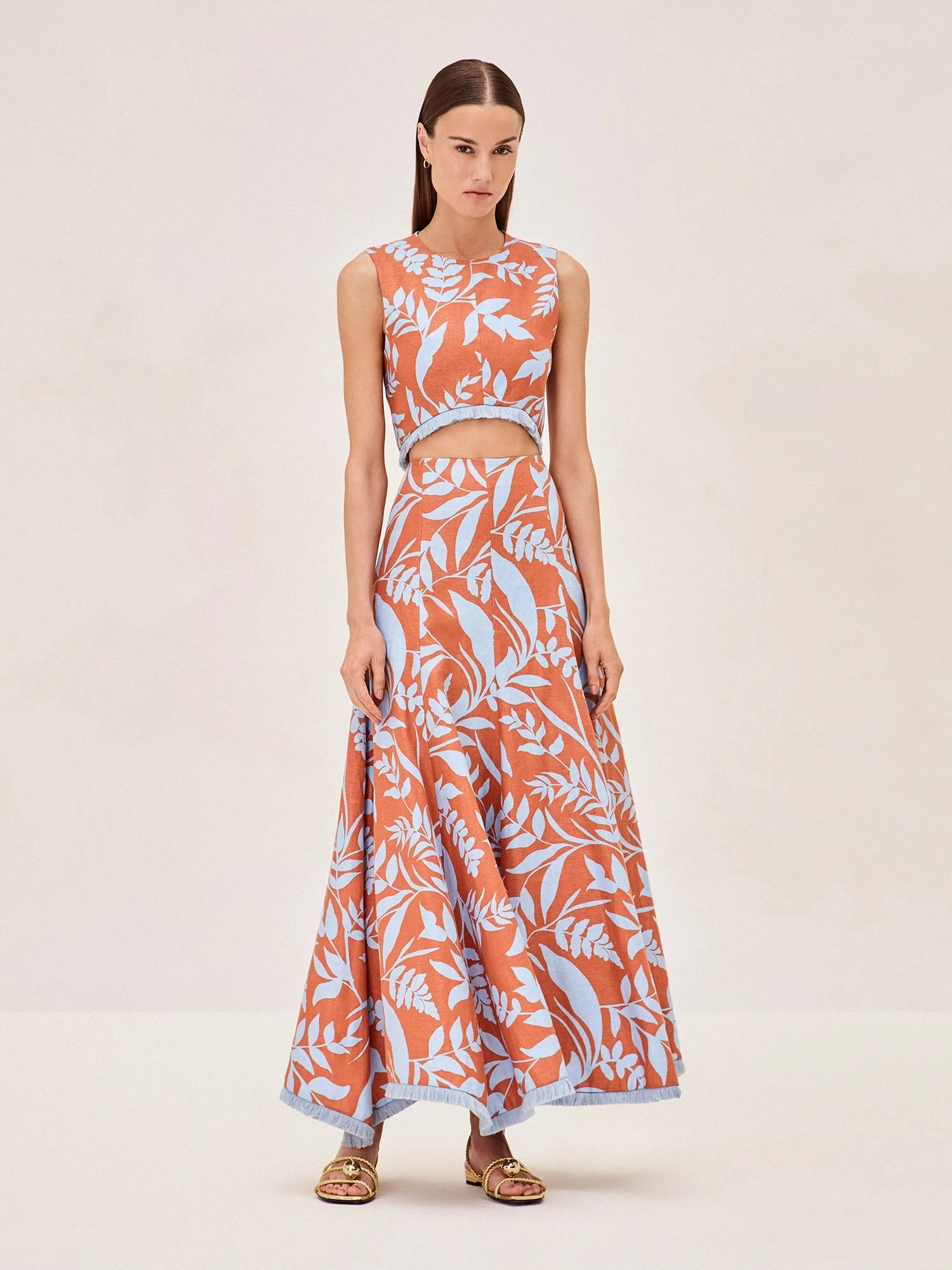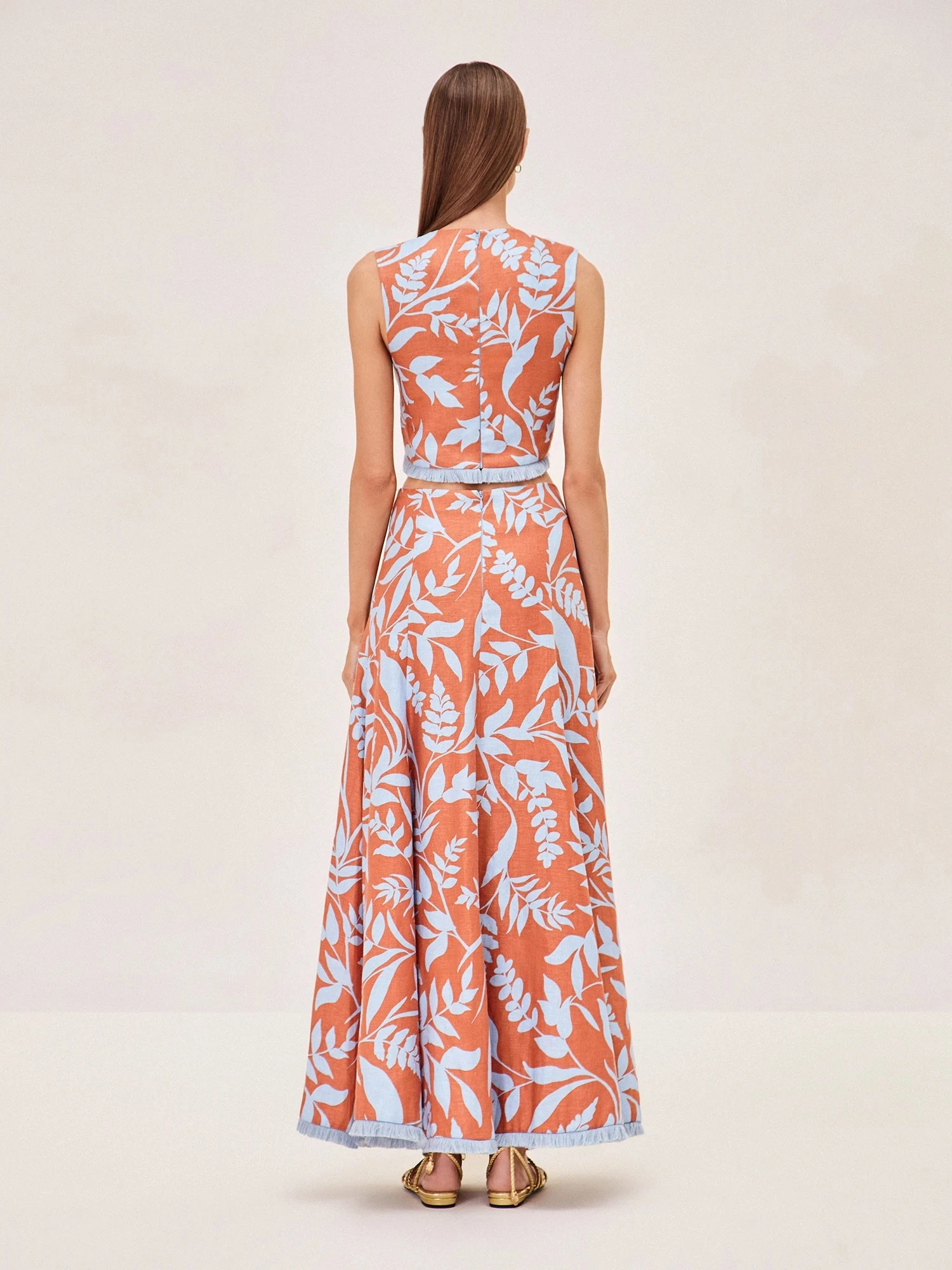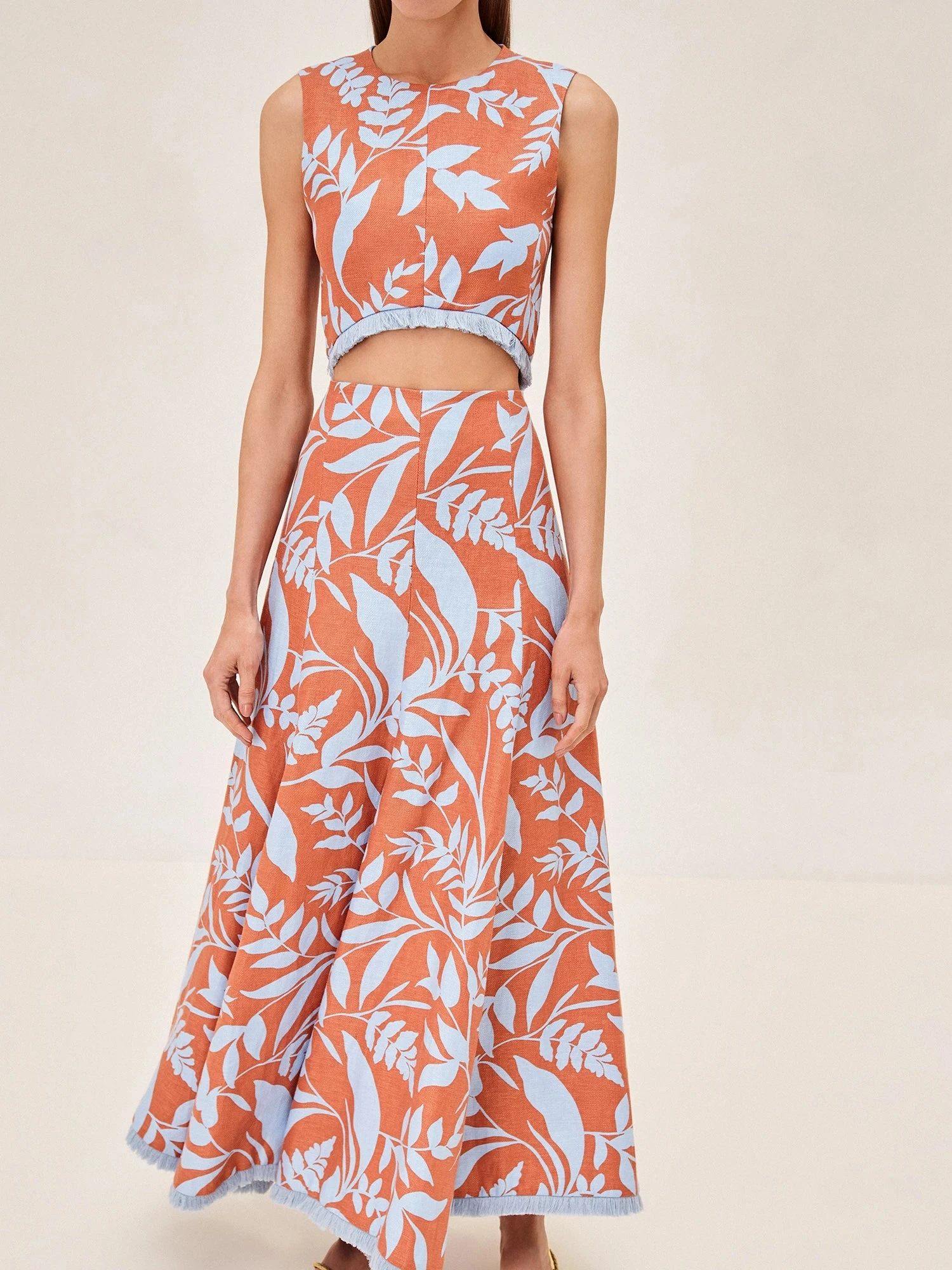 Discover the Brandt Skirt: a tribute to the vibrant energy of summer. Adorned with a lush leaf pattern in a palette of coral and azure, this linen set cascades gracefully to capture the essence of a tropical getaway. Its fluid silhouette promises to sway with your every step, offering a dance of color and comfort. Pair with a simple top to let its bold print shine or with the Chace Top for a perfectly curated look.