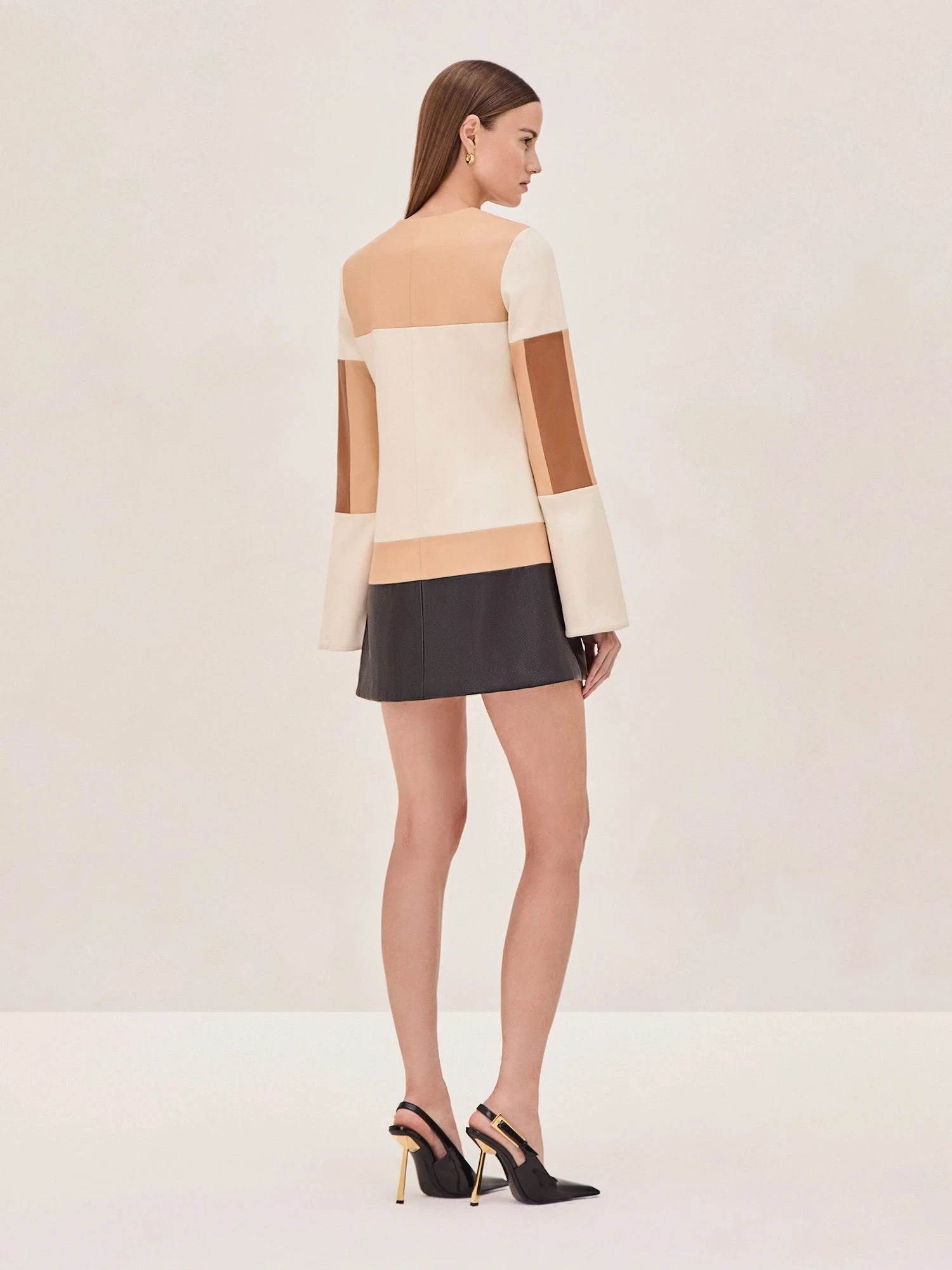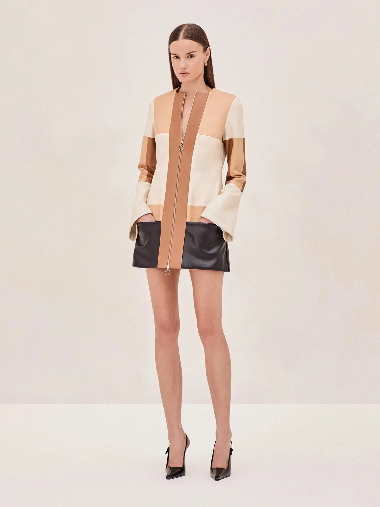 Introducing the Cameron Vegan Leather Mini Dress—a bold and modern take on classic tailoring. Designed in soft vegan leather with a striking color-block pattern, this mini dress brings a sharp edge to your wardrobe. The clean lines and structured silhouette are balanced by its subtle bell sleeves and a front zip detail.