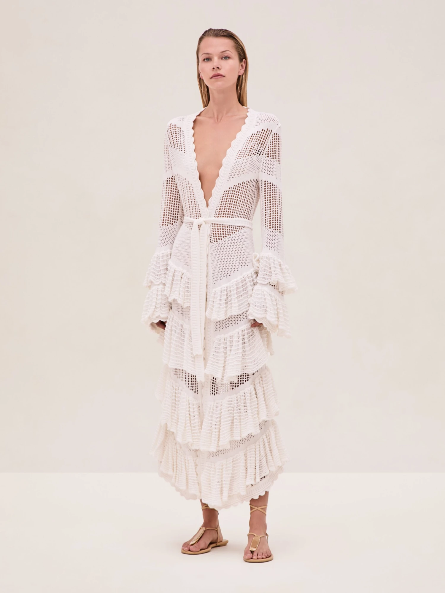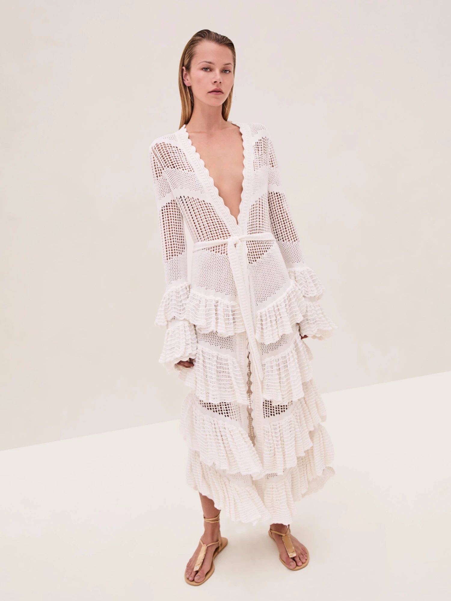 The Cari Robe is a button-down knit design featuring tiered ruffle detailing and a detachable sash.