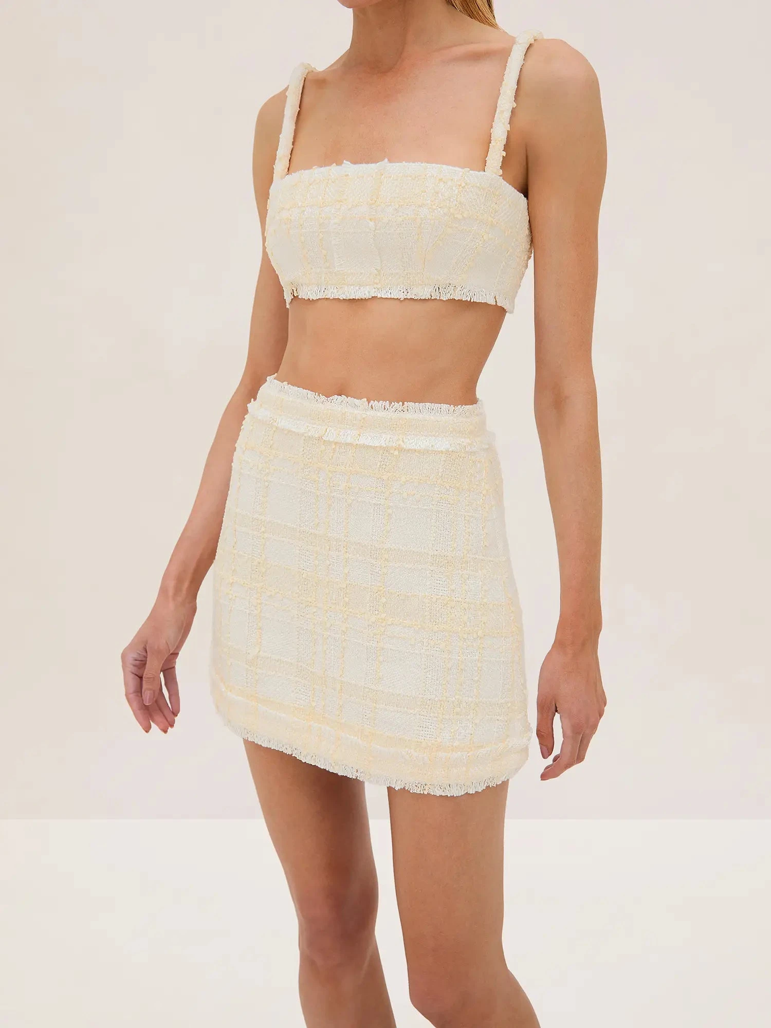 The Estrada Top is both daring and refined, showcasing a cropped tweed design. With delicate straps, pearly buttons, and a frayed edge, it pairs beautifully with the Elma Skirt for a stylish set. For a polished look, layer it with the Benning Jacket.