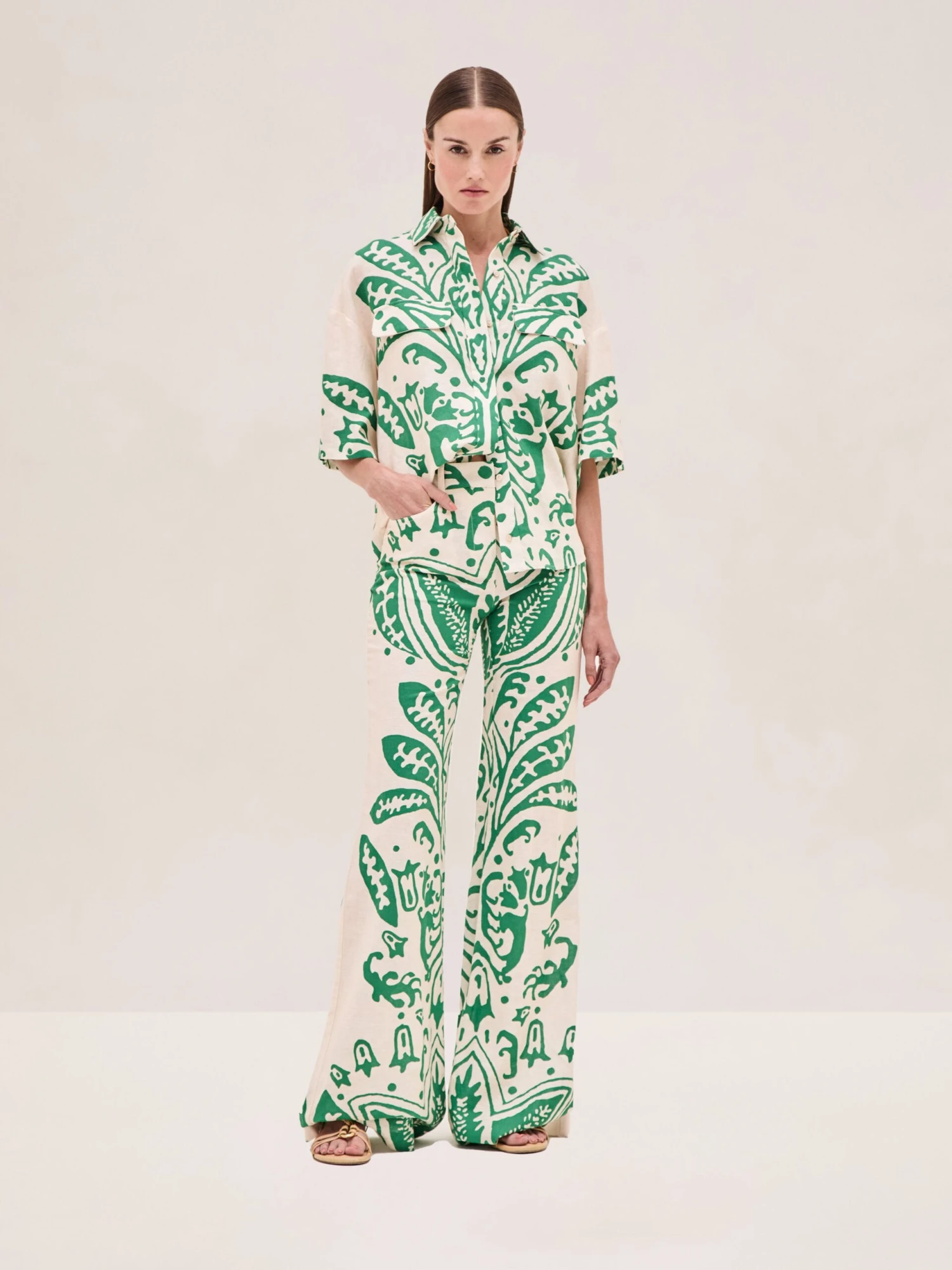 The Farad Top is a cotton linen blend printed button-down featuring front pocket details, paired with the Davi Pant.