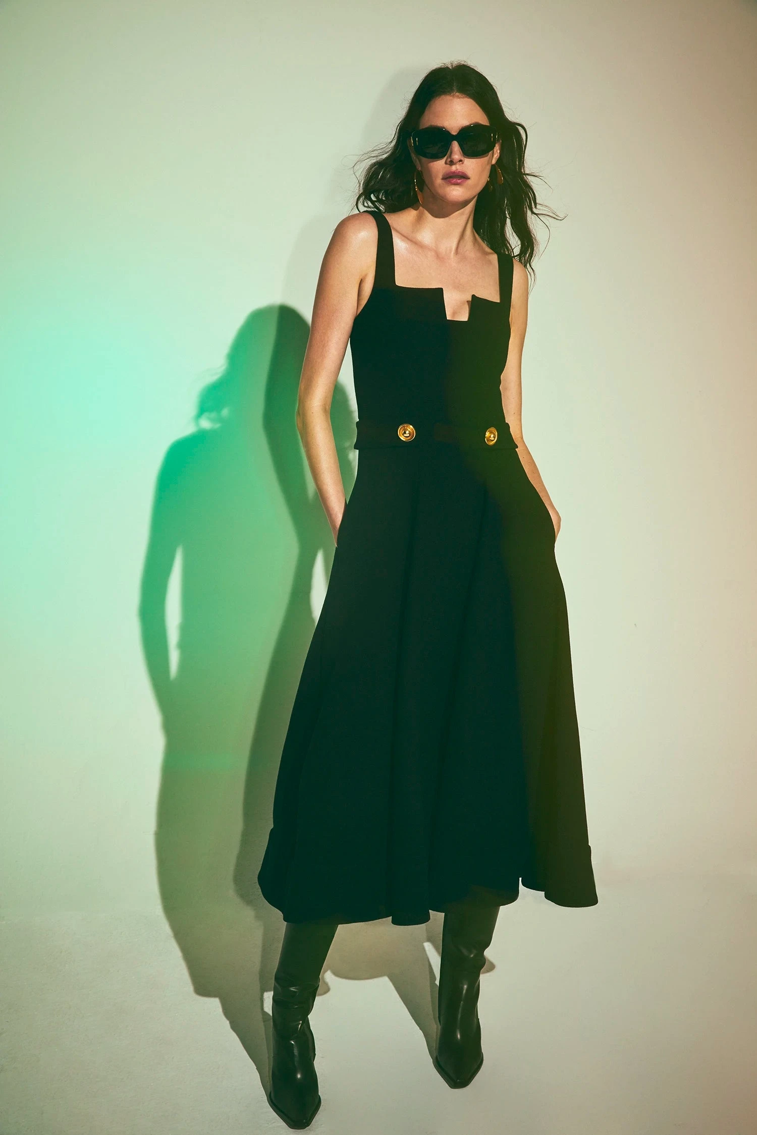 The Fiore Dress features a chic square neckline and a subtle cut-out detail, adding a modern twist to its timeless silhouette. The fitted bodice effortlessly transitions into a full skirt, striking the perfect balance between elegance and movement. The gold buttons add a touch of luxury, giving this dress just the right amount of standout appeal.
