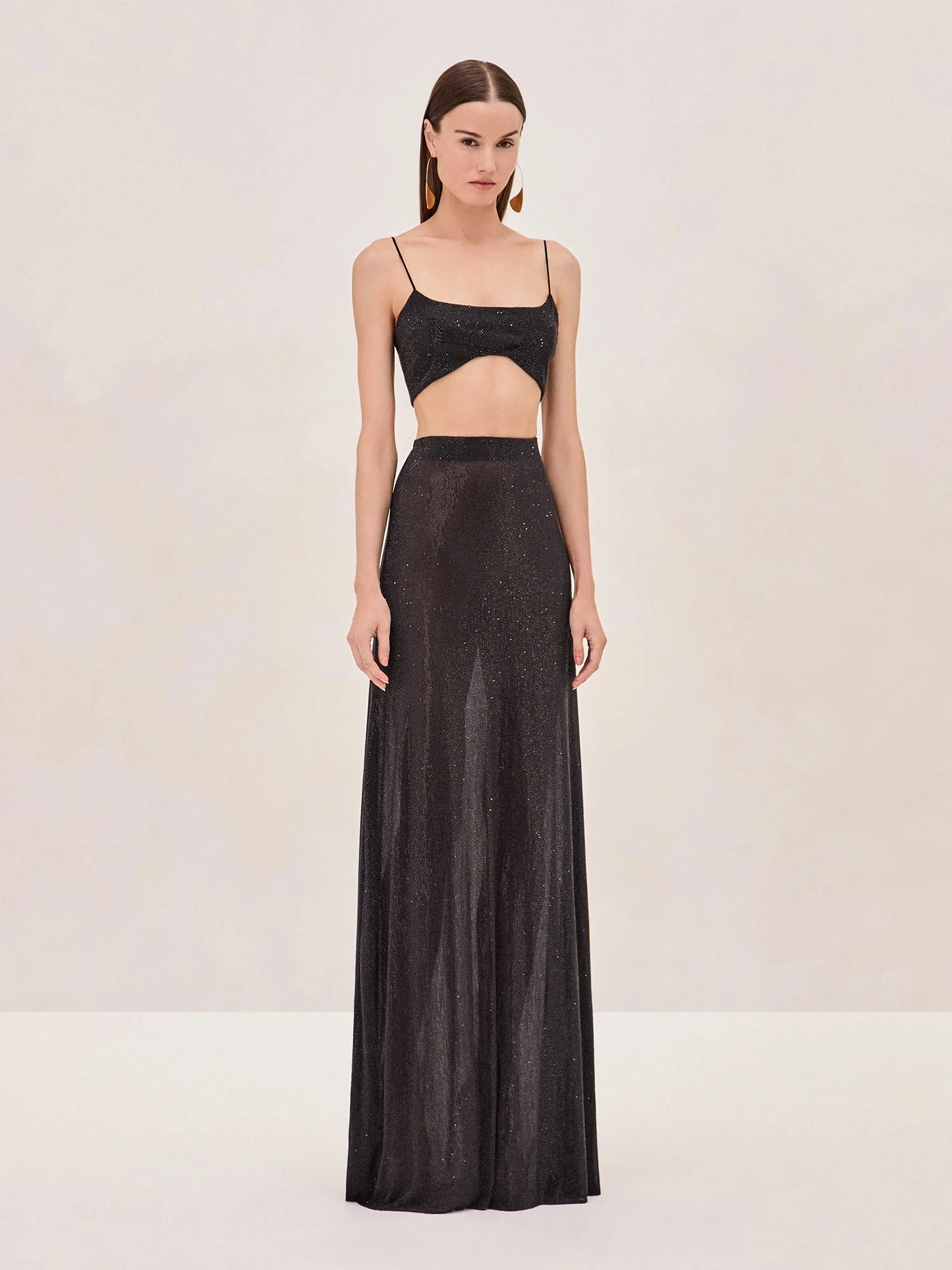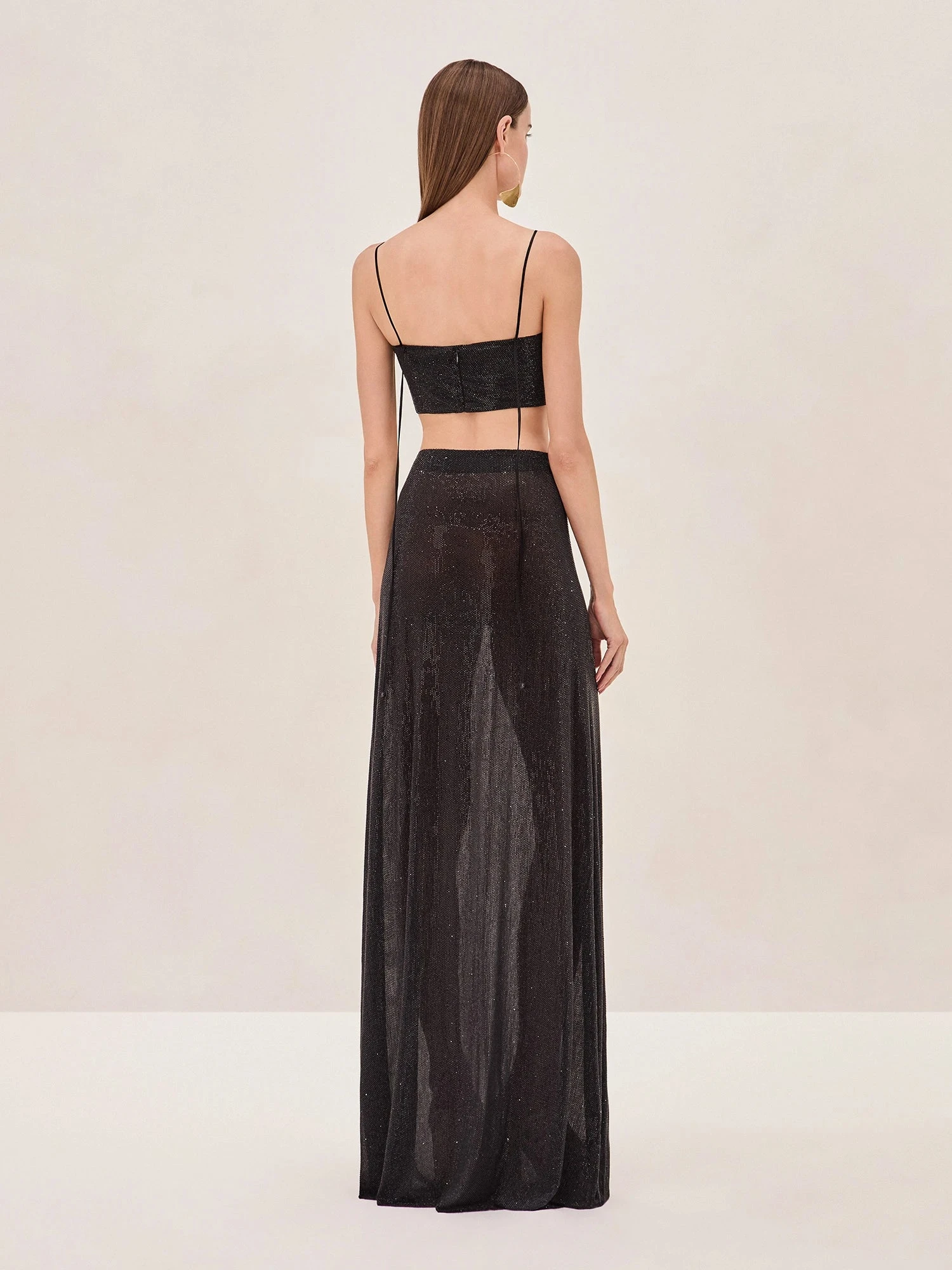 The Franca Skirt features a sleek silhouette that hugs the body, flaring out slightly for a flattering and dramatic effect. Designed to pair seamlessly with the Poli Crop Top, the Franca Skirt creates a chic, coordinated look perfect for evening events or special occasions. The minimalist design allows for versatile styling.
