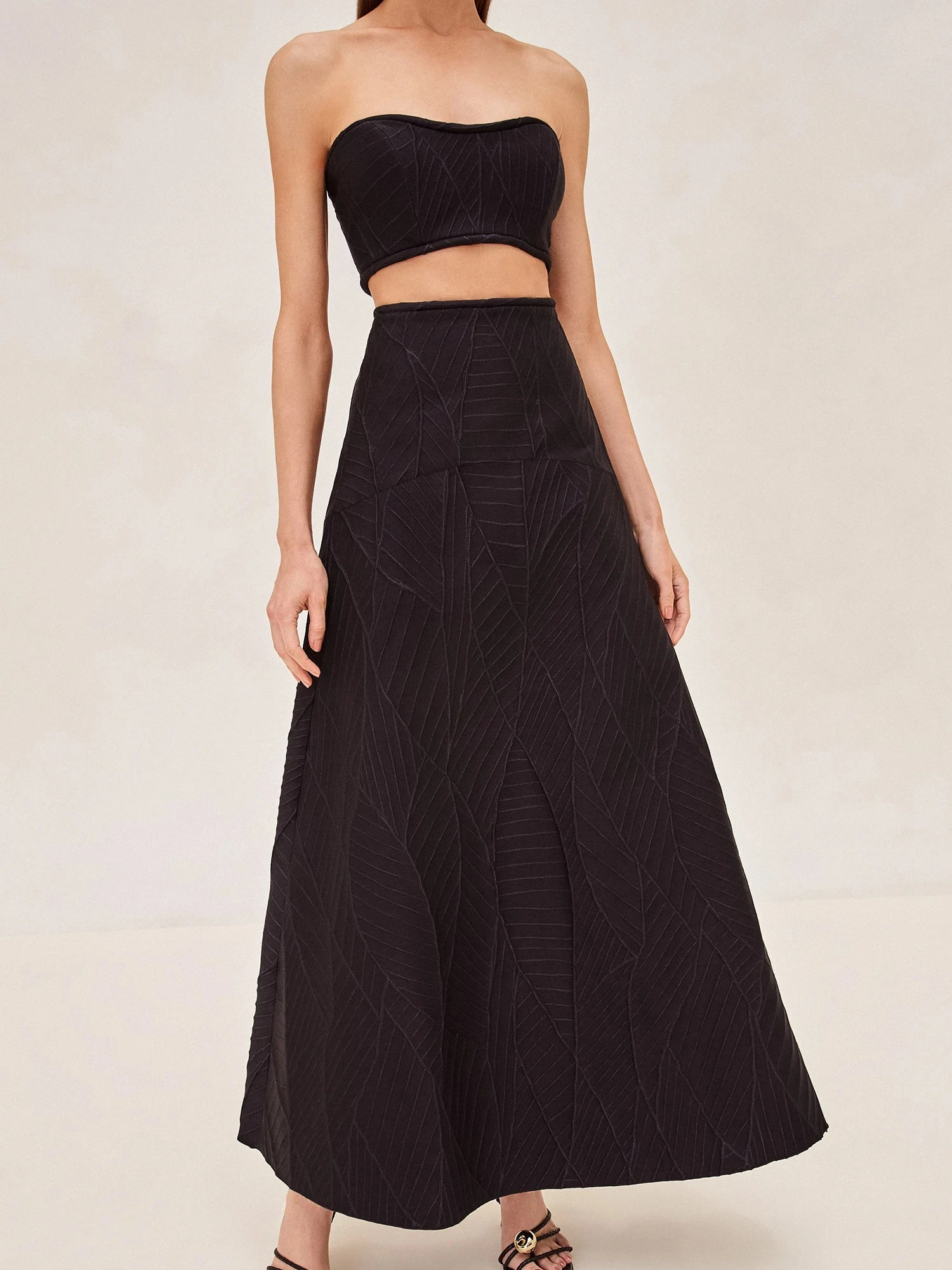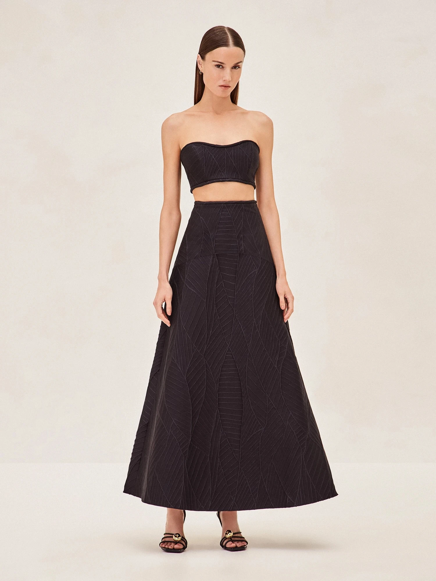 The Gardenia Skirt is a stunning display of minimalistic design and refined fashion. The subtle leaf motif imprinted on the fabric exudes a sense of sophistication, making it a versatile garment for any occasion. Featuring a high-waisted fit, midi length, and flowing silhouette, the Gardenia Skirt epitomizes effortless elegance. Wear with the Alini Top to achieve a polished look.