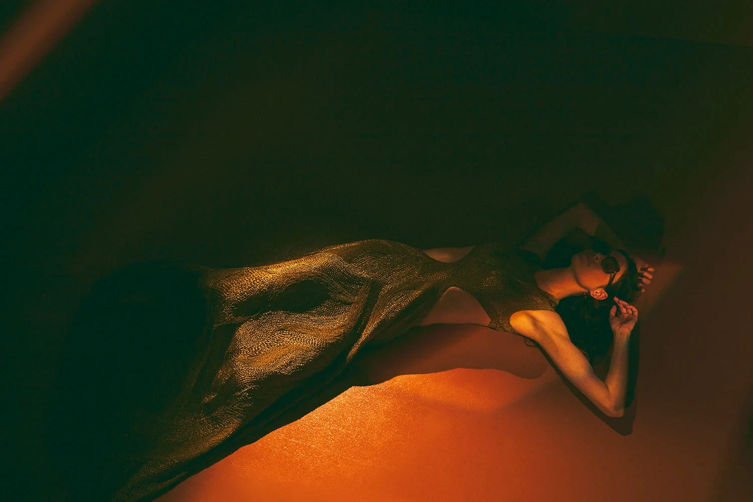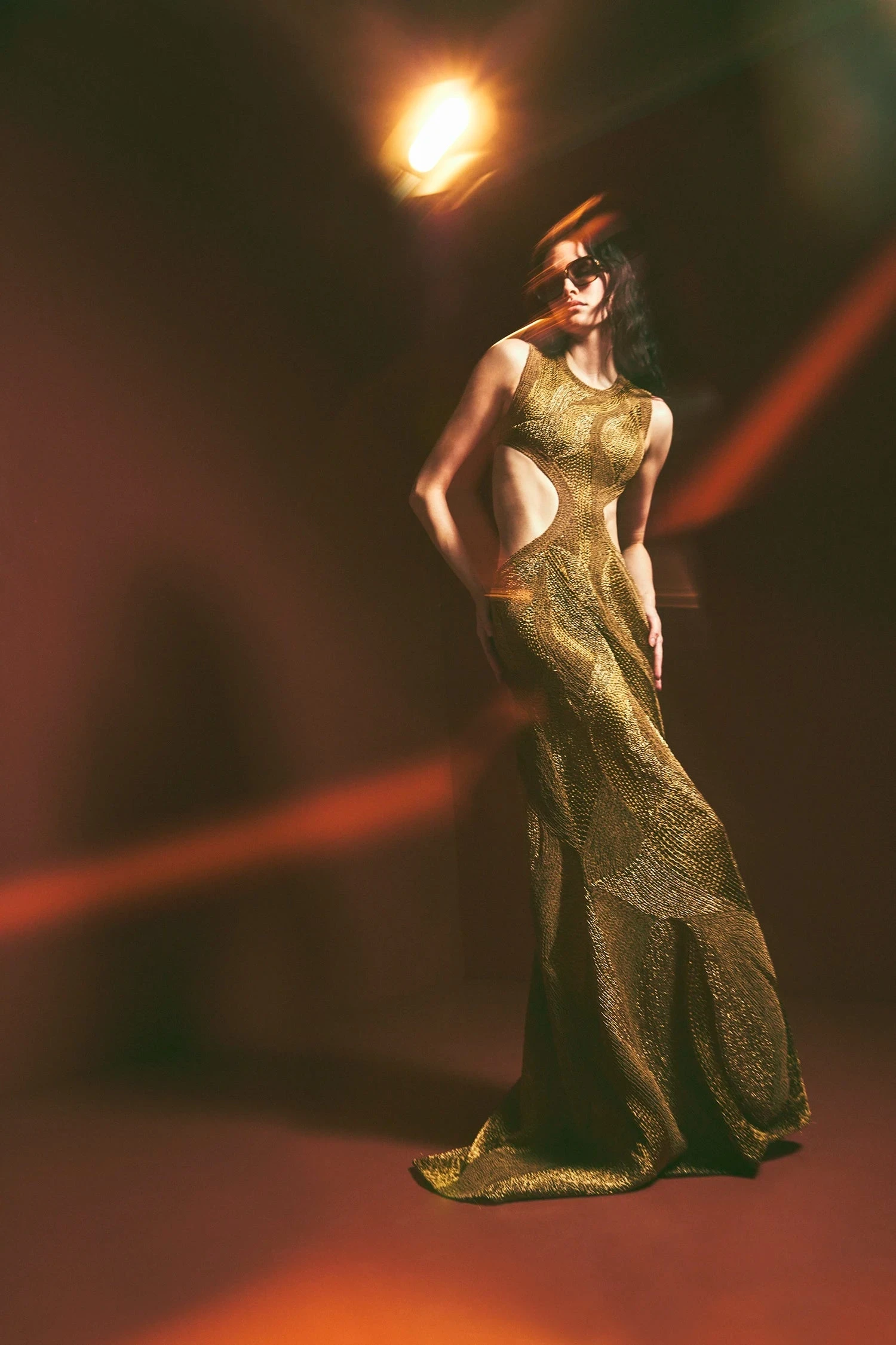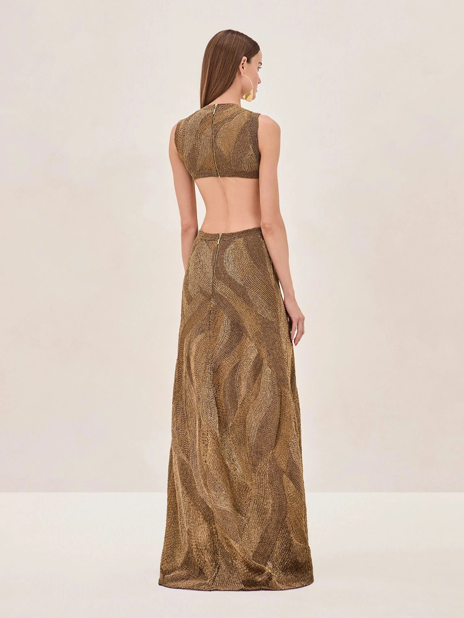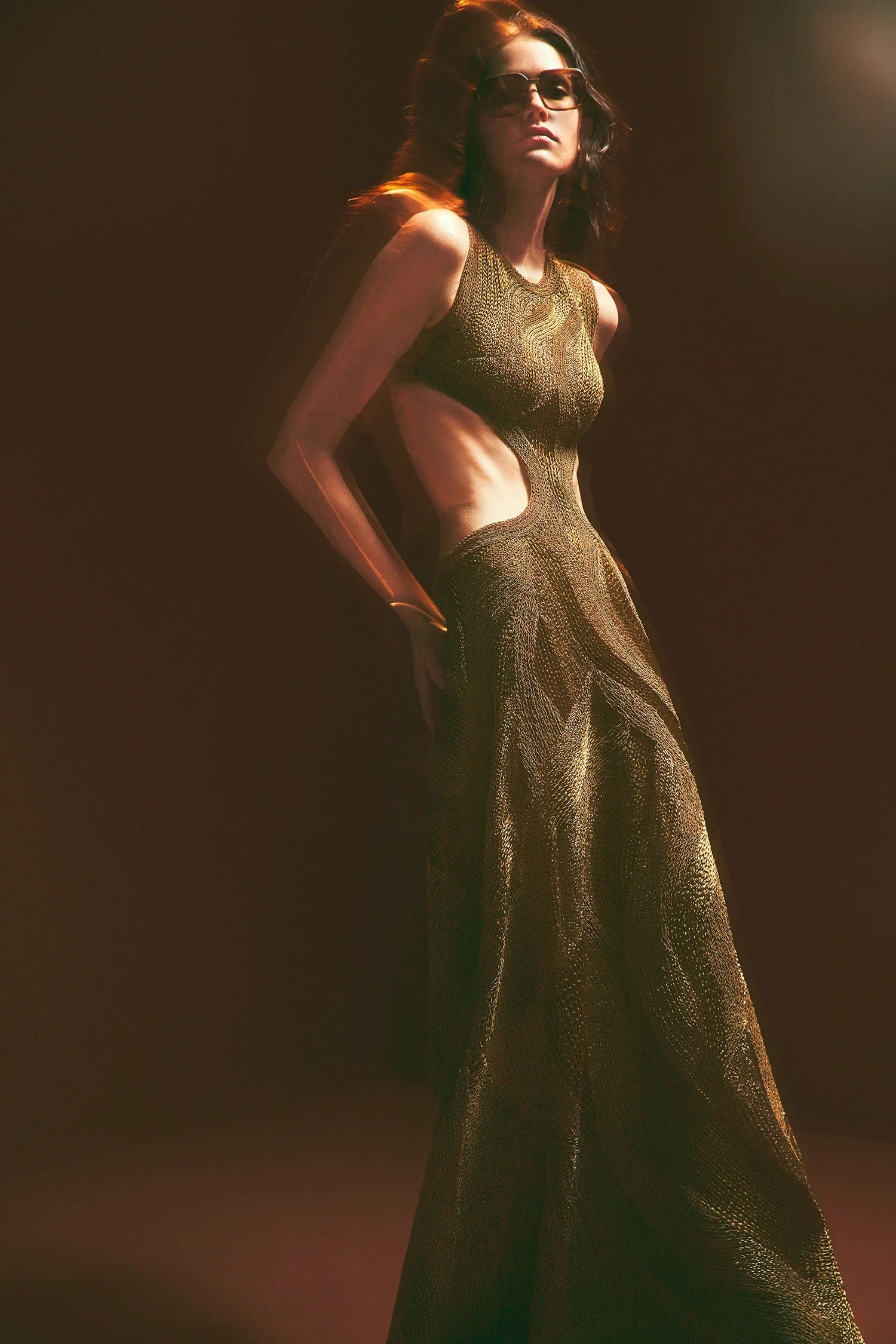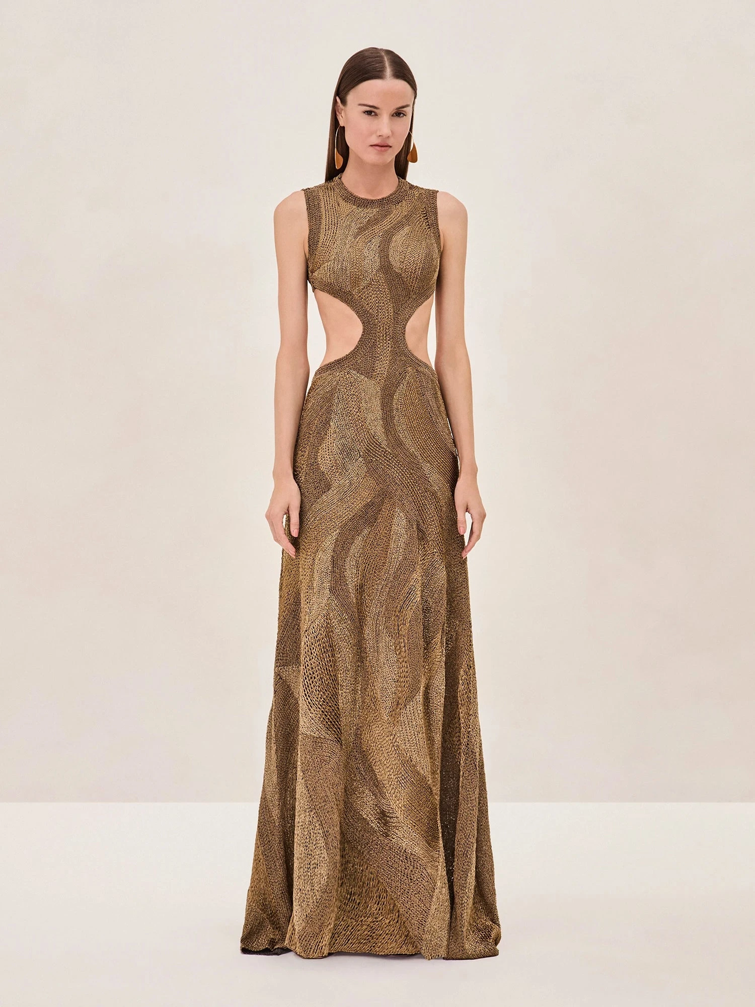 Introducing the Haven Dress – a masterclass in bold elegance. Sculpted to perfection, it hugs your curves with its chain-link texture, creating a look that’s both sleek and striking. With daring cutouts that accentuate the waist and a floor-length silhouette, it’s your ultimate statement piece.