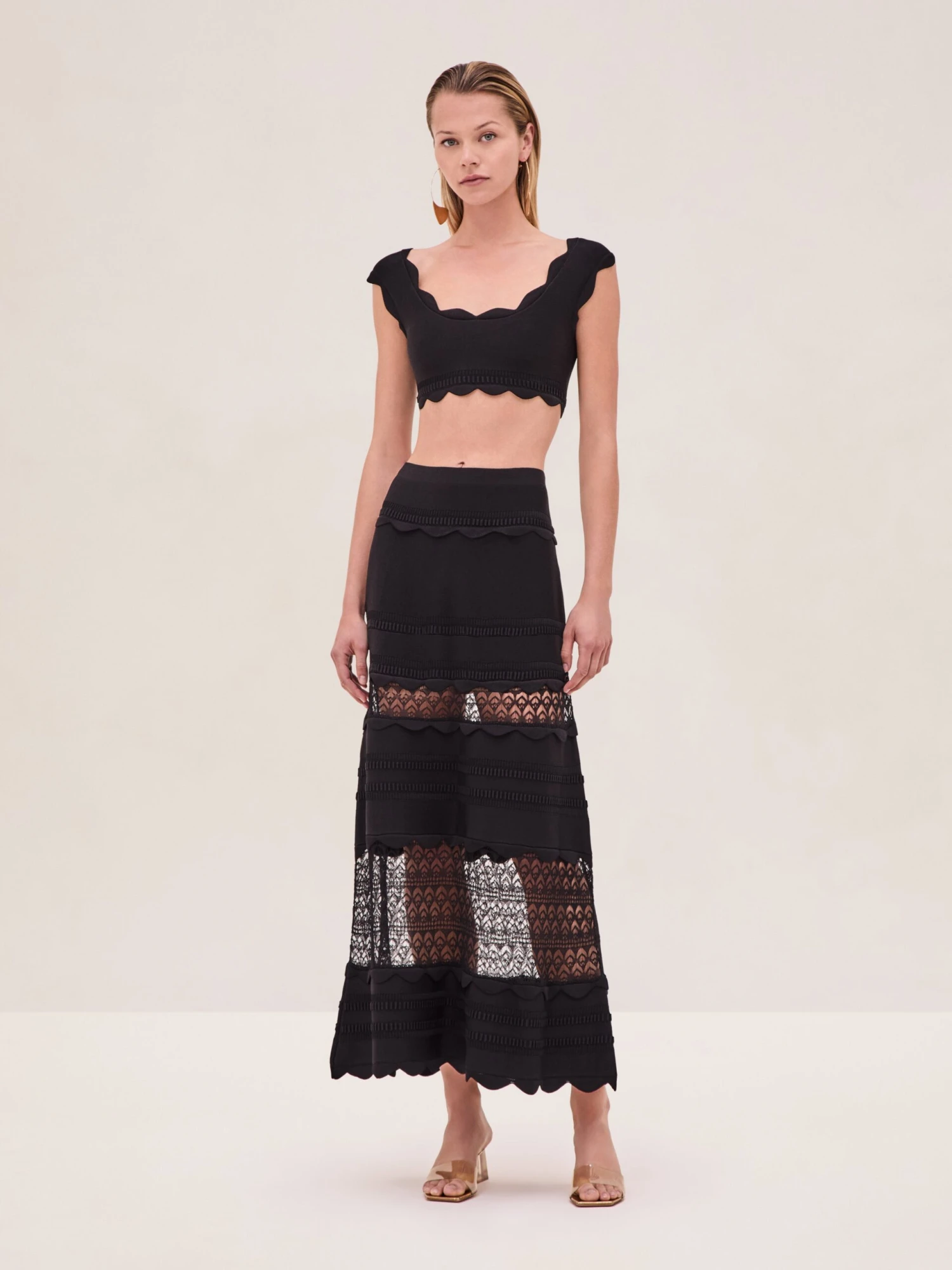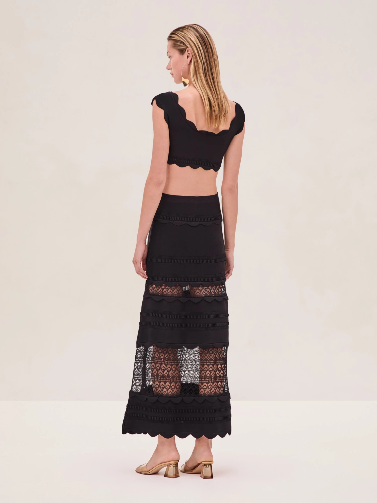 The Jeannie Skirt is a scalloped trim knit skirt featuring lace inserts, paired with the Lise Top.