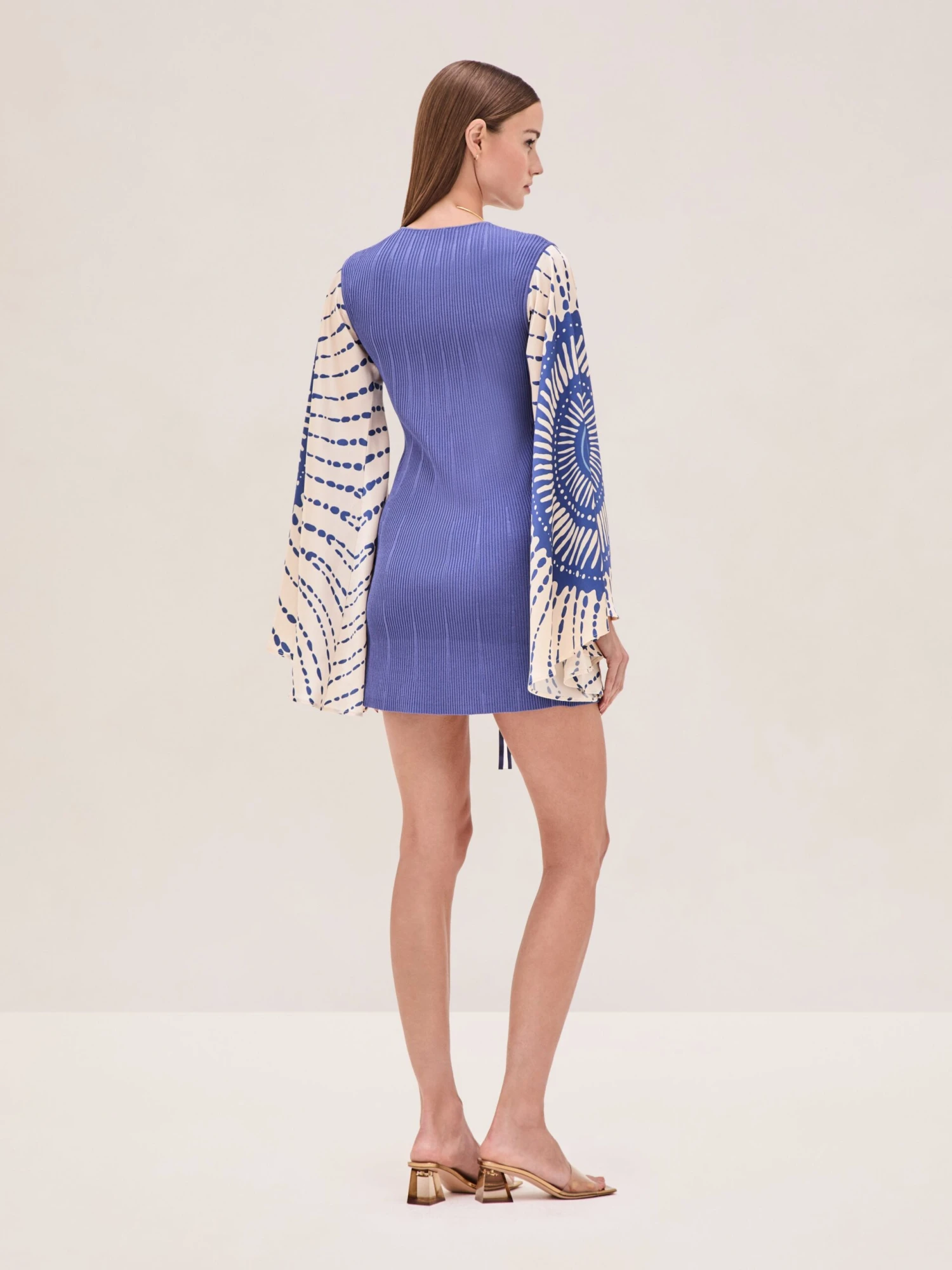 The Lai Dress features a knit body with a V-neckline, delicate tie closure and long statement sleeves showcasing a bold sunburst print.