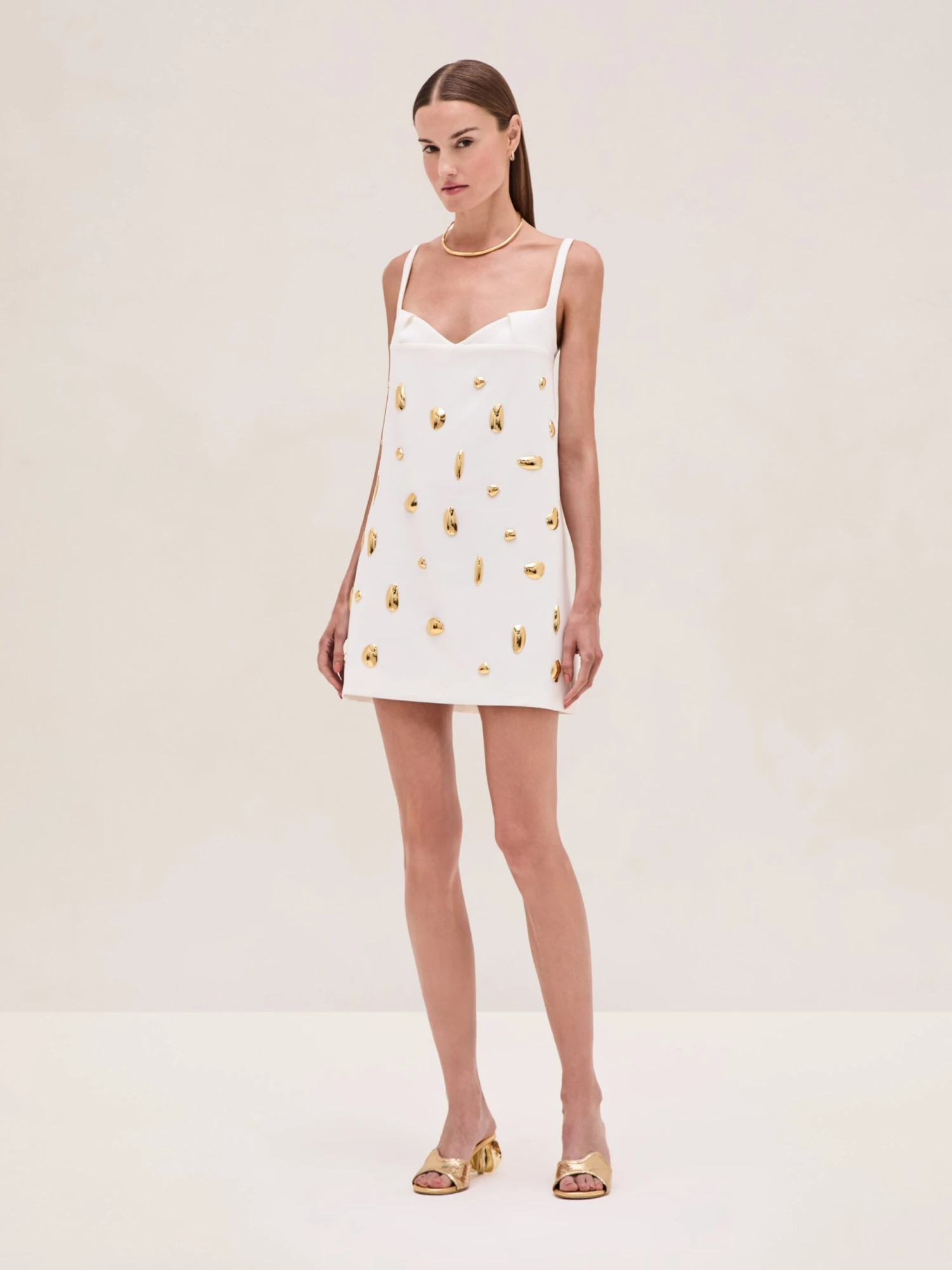 The Larsen Dress is a crepe A-line mini dress with gold hand-sewn appliqués.