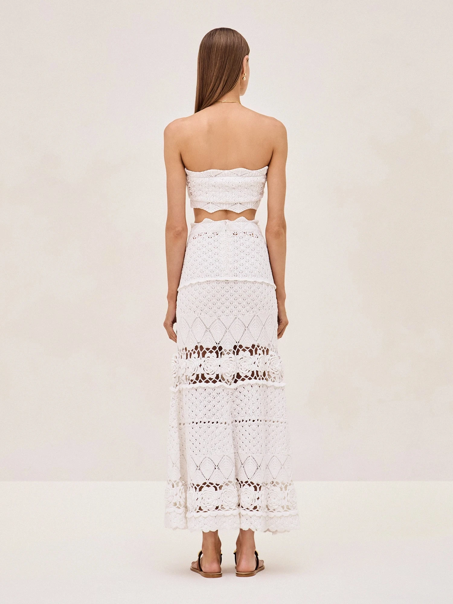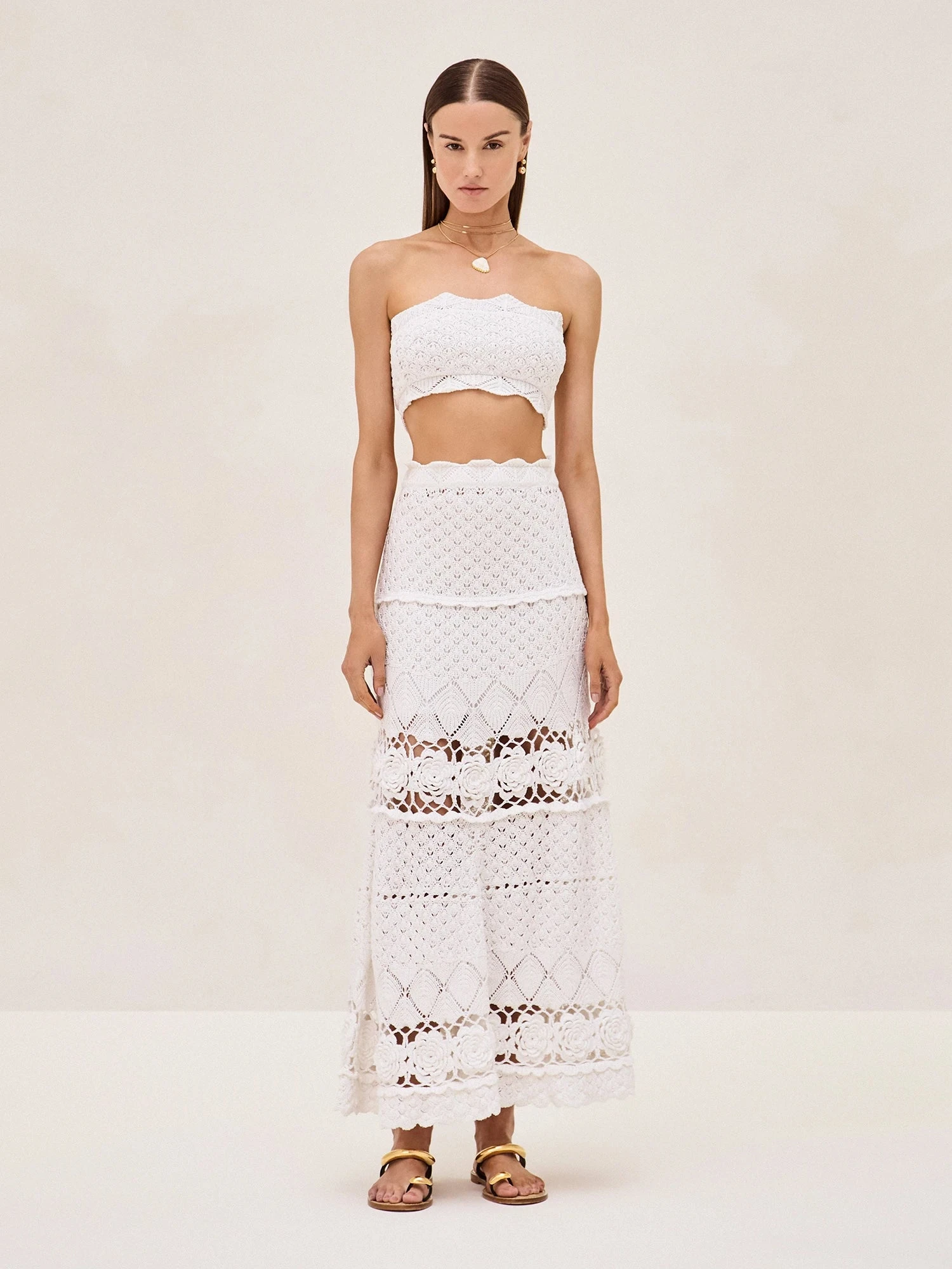 This strapless crochet crop top features a delicate scalloped edge that adds a touch of femininity. Pair it with the matching Jana Skirt for a cohesive and elegant look, or layer it under the Vosen Top for added dimension and style. Whether you’re dressing up for a special event or embracing a chic, casual vibe, the Lily Top offers versatile elegance that’s sure to turn heads.
