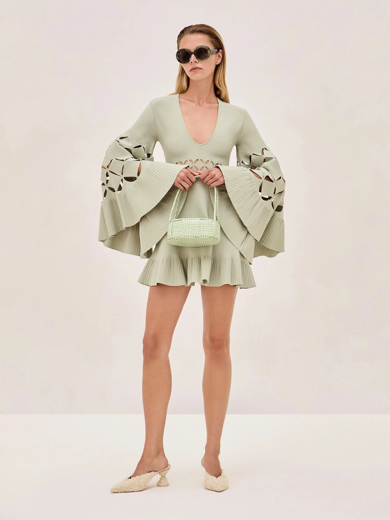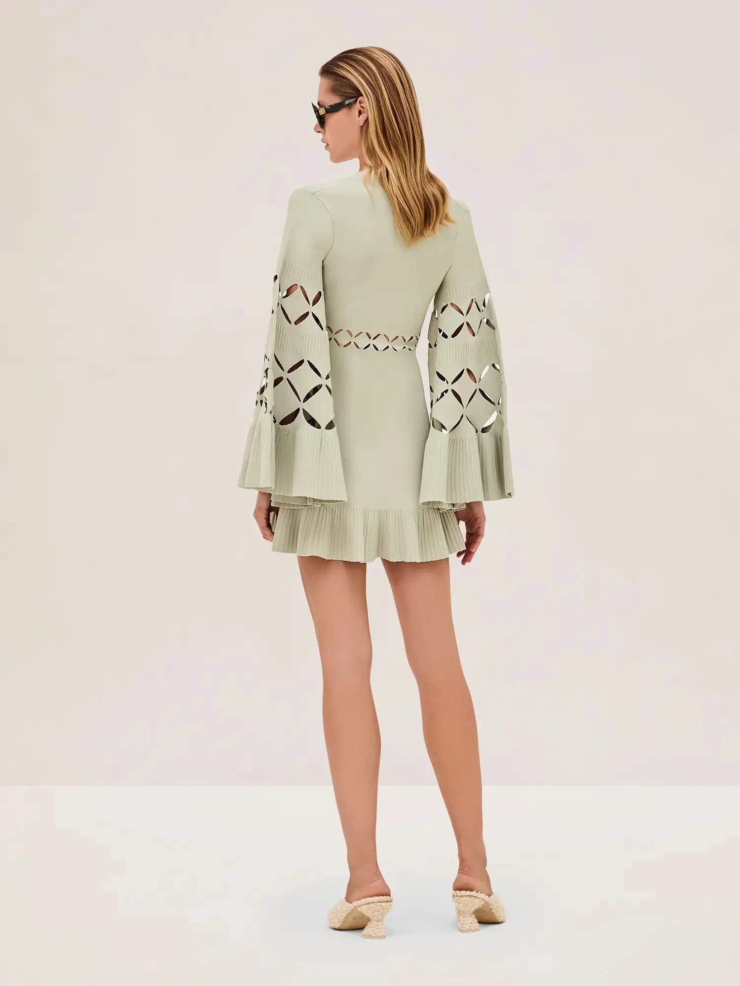 The Linden Dress features flowy bell sleeves, intricate cutout details, and pleated accents. This mini dress brings a touch of sophistication to any occasion, while the fit-and-flare silhouette ensures a flattering and comfortable fit.