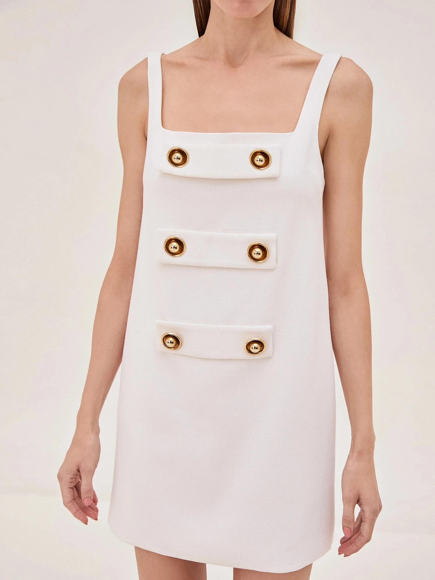The Luya dress features a chic square neckline and a sleek silhouette that flatters your figure. The standout gold button details add a touch of luxury and sophistication, giving the dress a timeless appeal with a contemporary twist. Pair the Luya Dress with the Bartan Jacket for a look that exudes effortless style
