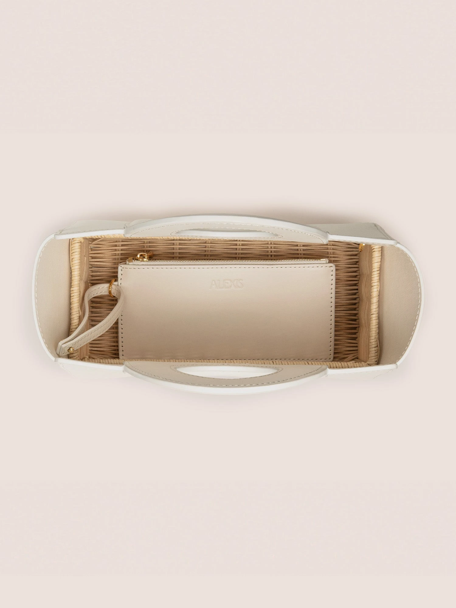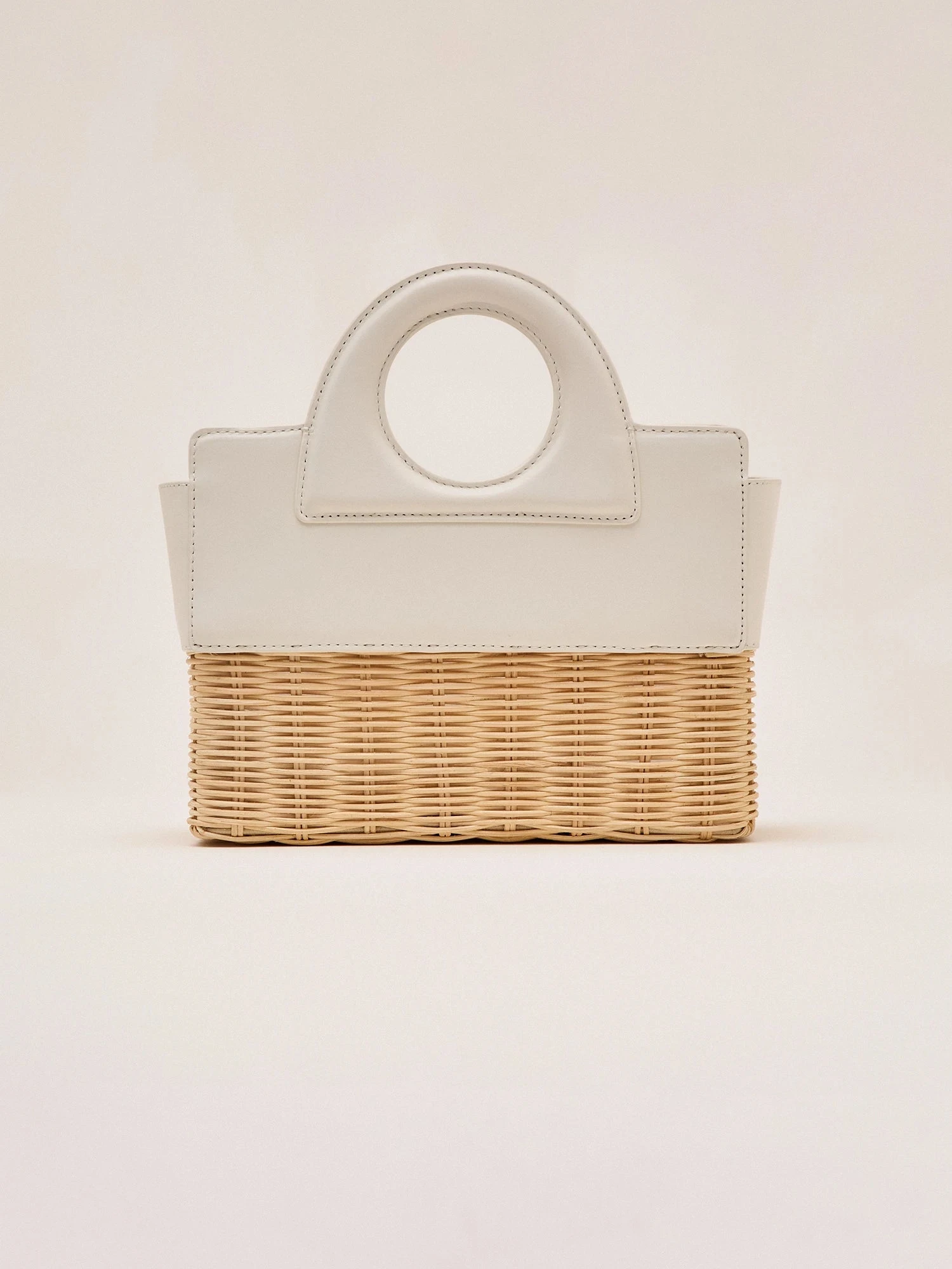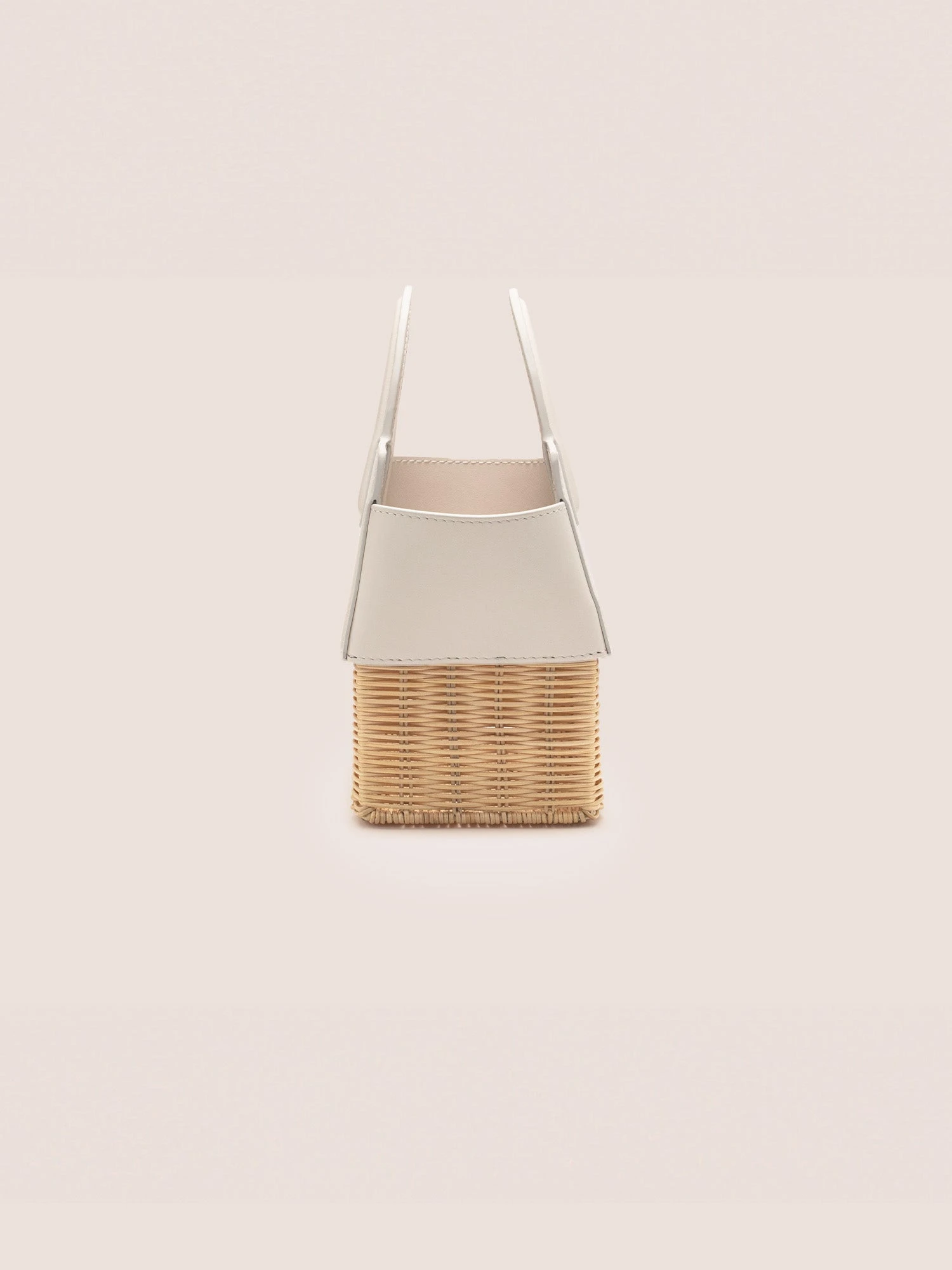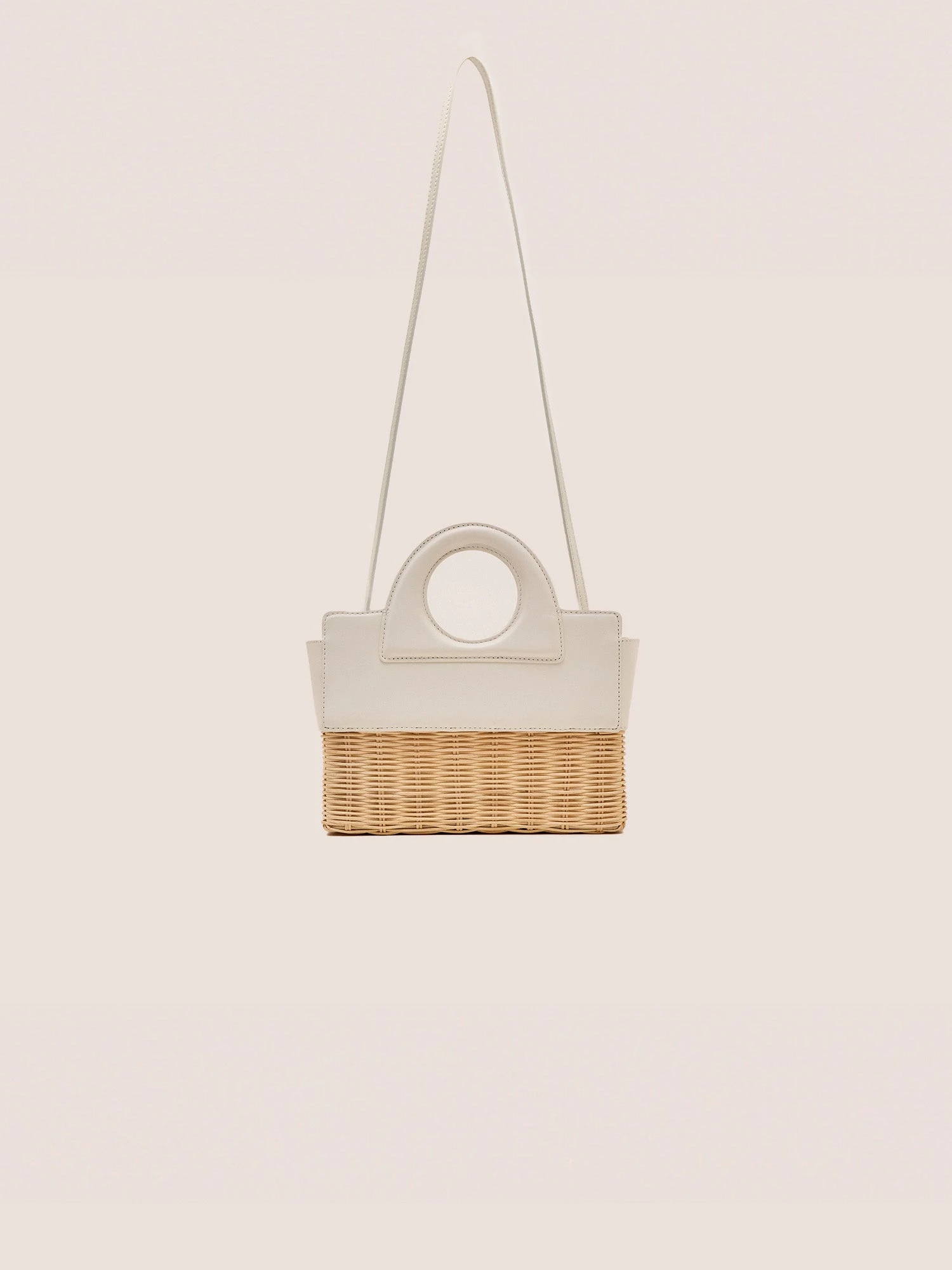 The Penelope hand bag is a blend of leather and handwoven rattan, featuring a structured silhouette. Designed with a removable interior leather pouch and a detachable crossbody strap for versatile styling.