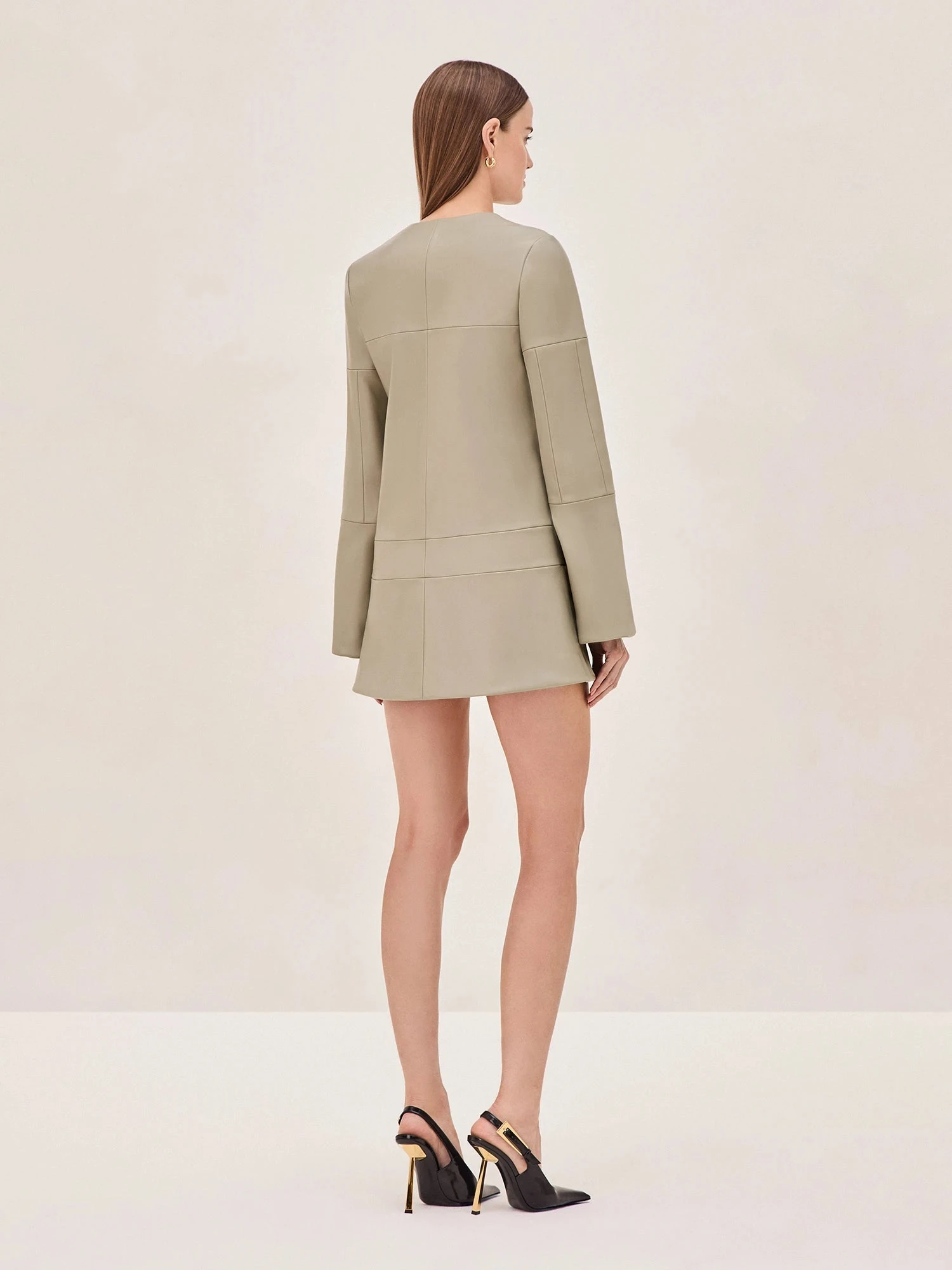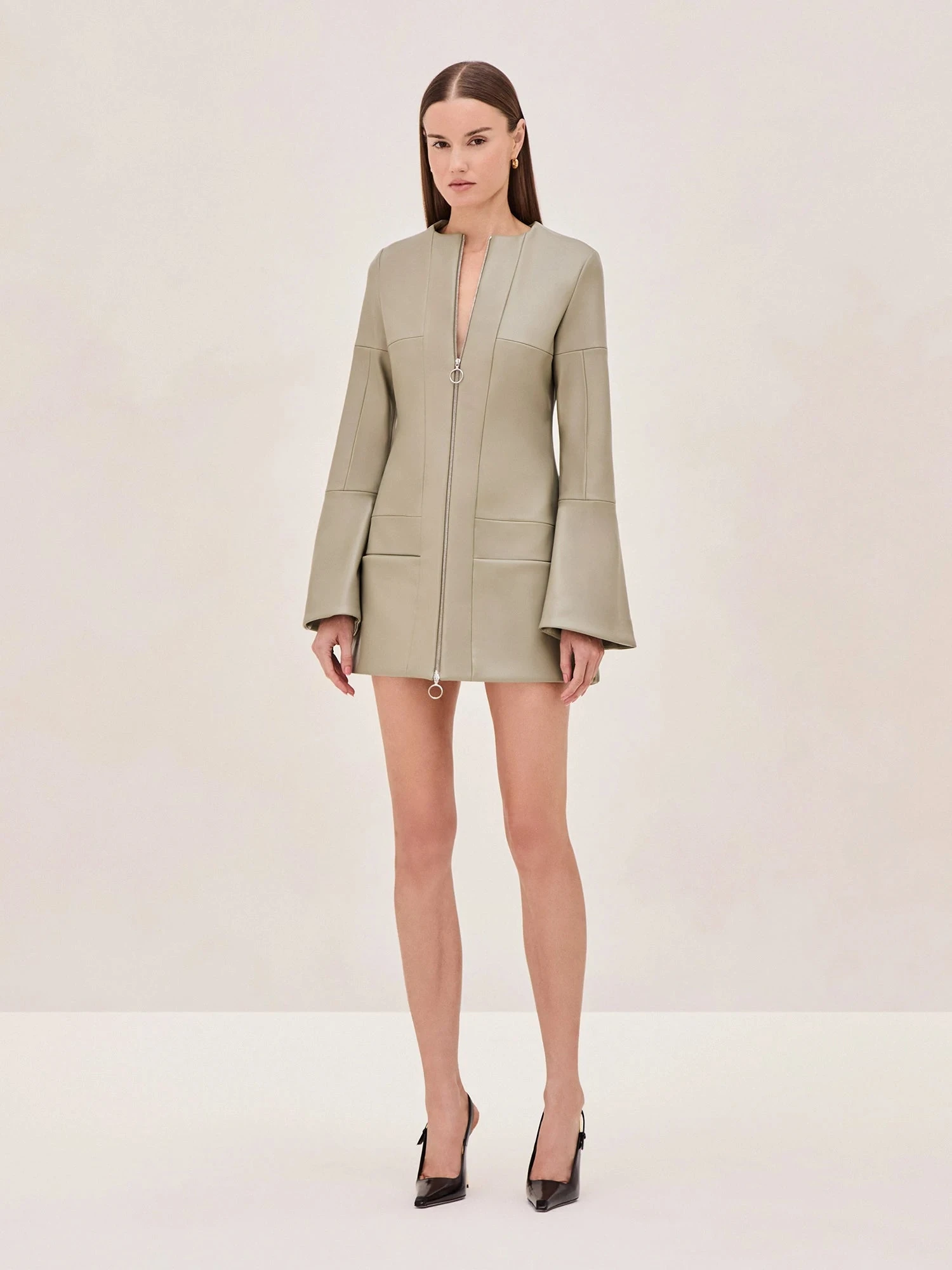 Introducing the Rossie Vegan Leather Mini Dress—a bold and modern take on classic tailoring. Designed in soft vegan leather this mini dress brings a sharp edge to your wardrobe. The clean lines and structured silhouette are balanced by its subtle bell sleeves and a front zip detail.