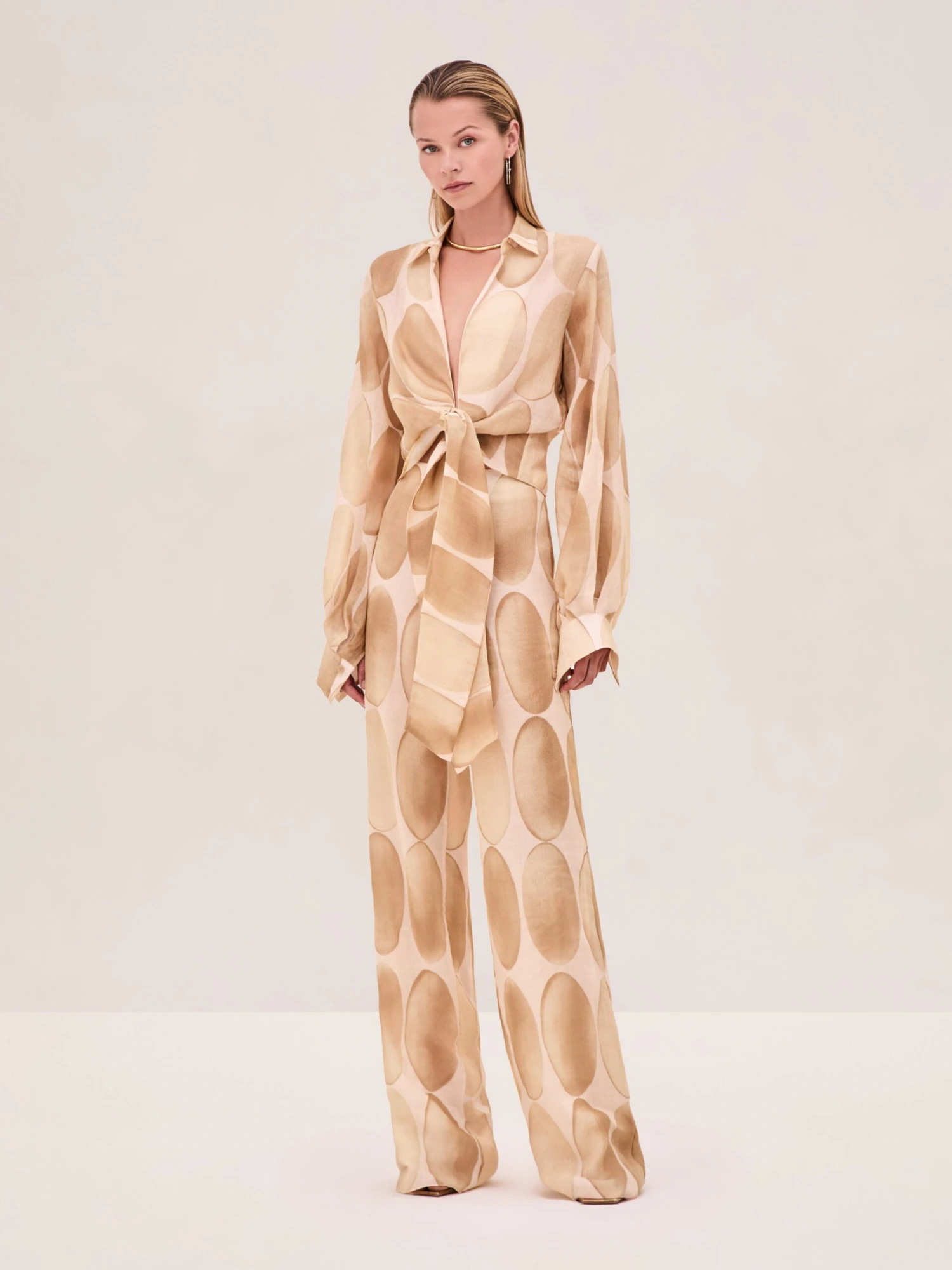 The Sarif Pant is a relaxed-fit pant with a back zip closure, paired with the Desai Top.