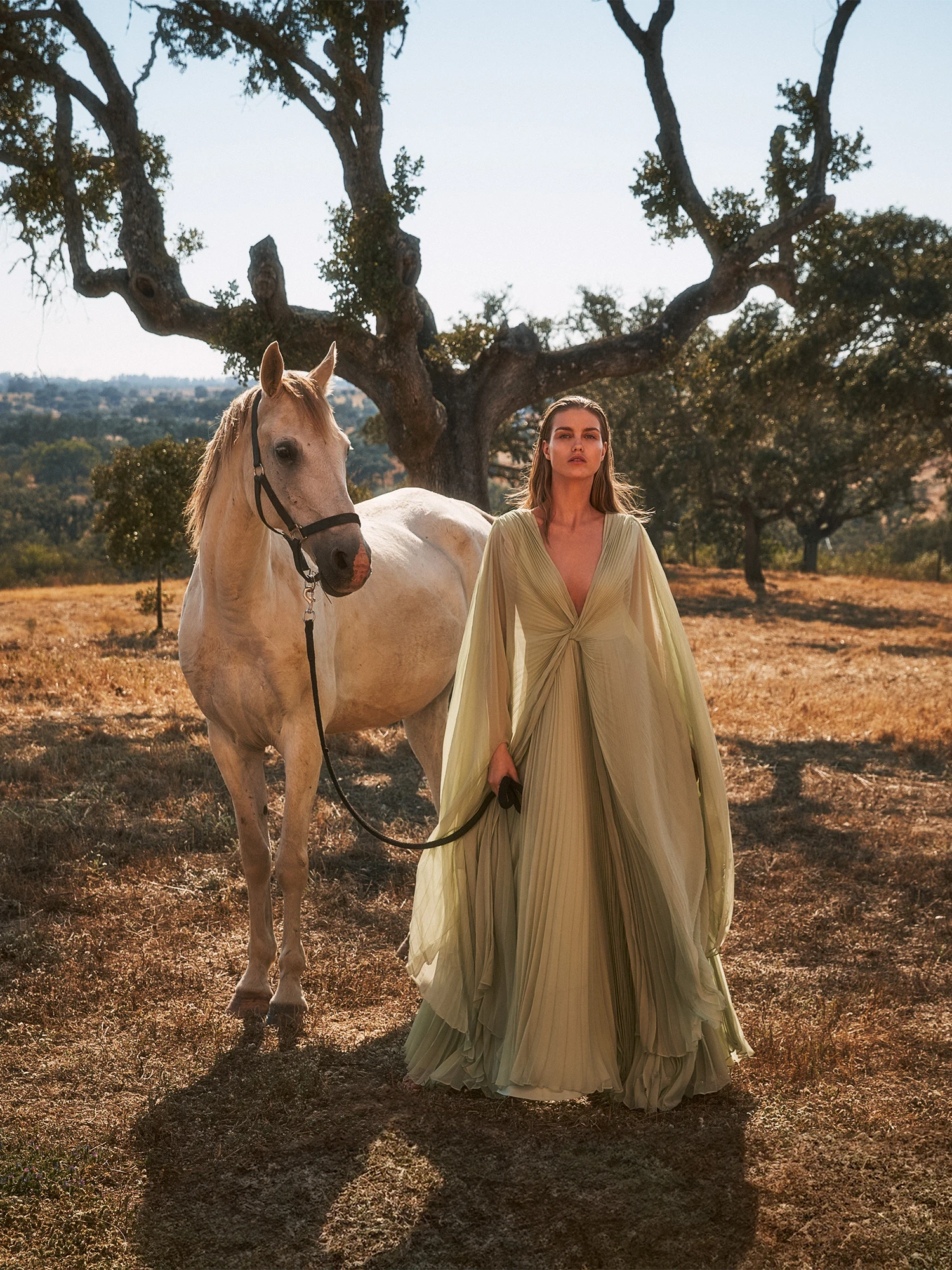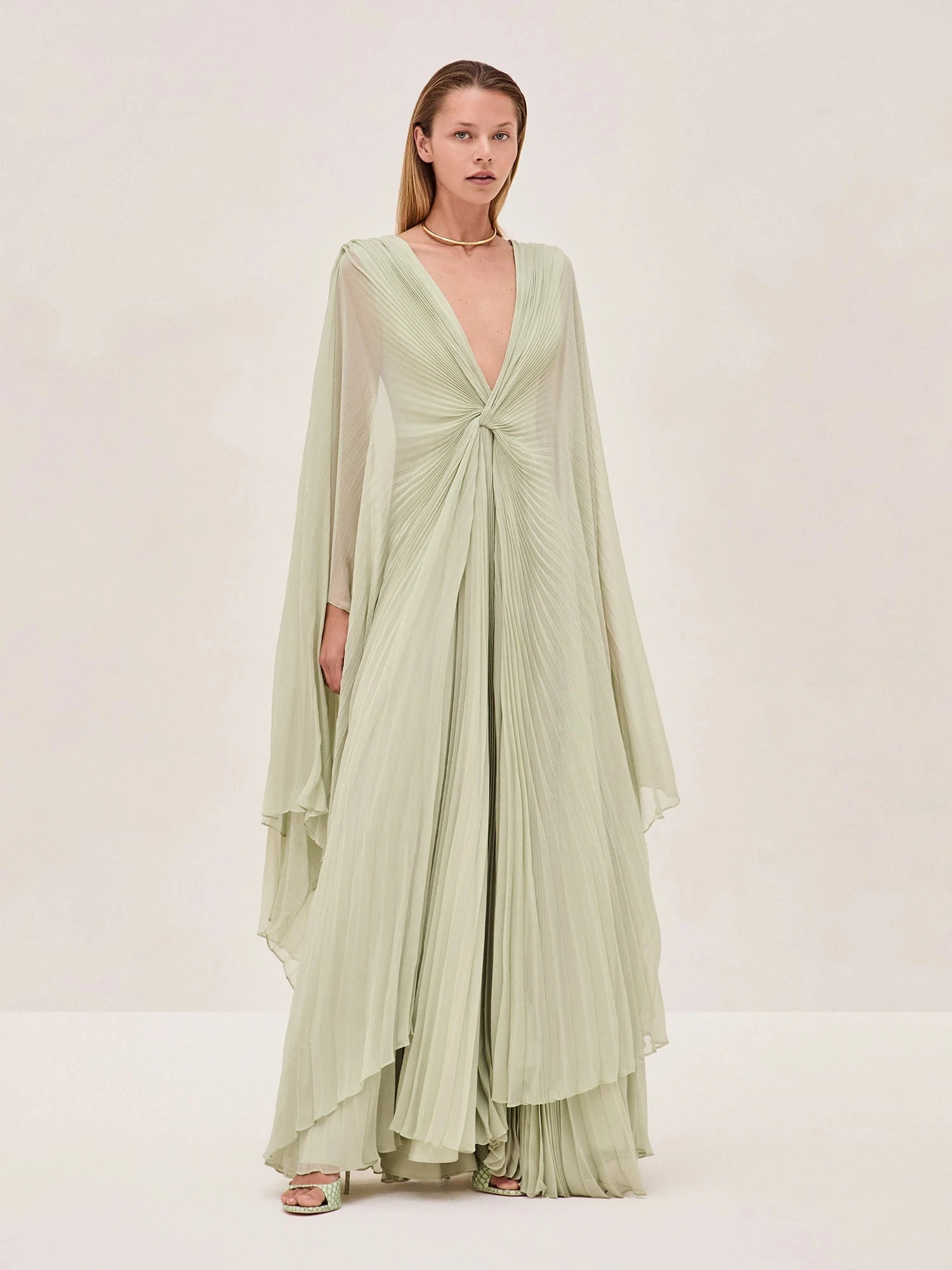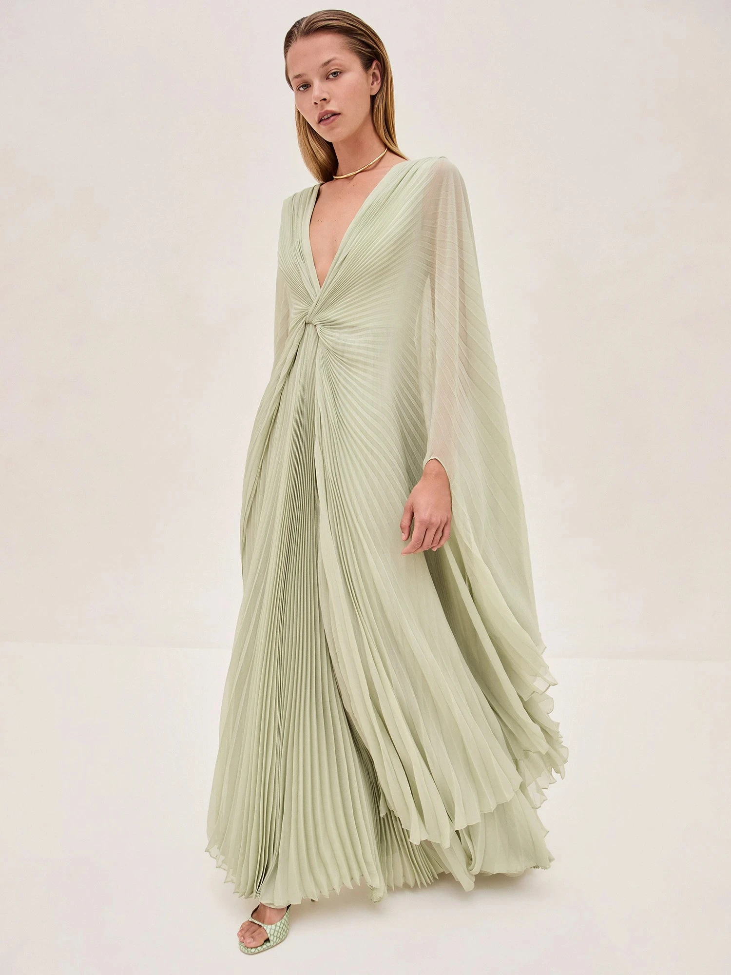 The Serdena Dress exudes elegance with its striking silhouette and luxurious pleated design. Featuring a plunging V-neckline, it gathers beautifully at the waist, creating a flattering twist detail. The flowing cape-like sleeves add movement and drama, while the floor-length hemline enhances its sophisticated appeal.