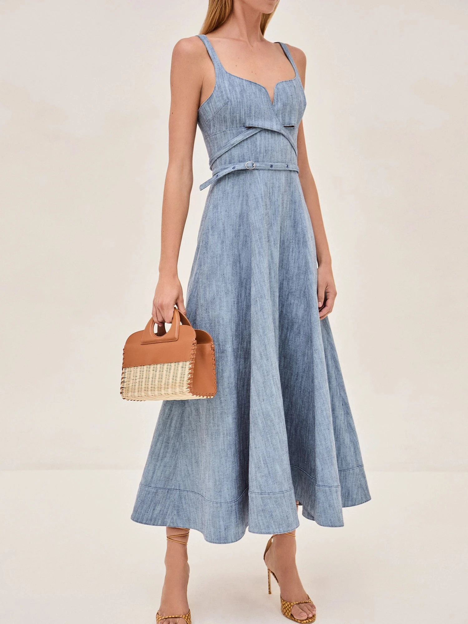 The Sirene Dress has dainty straps, a sweetheart neckline, and a belt at the waist.