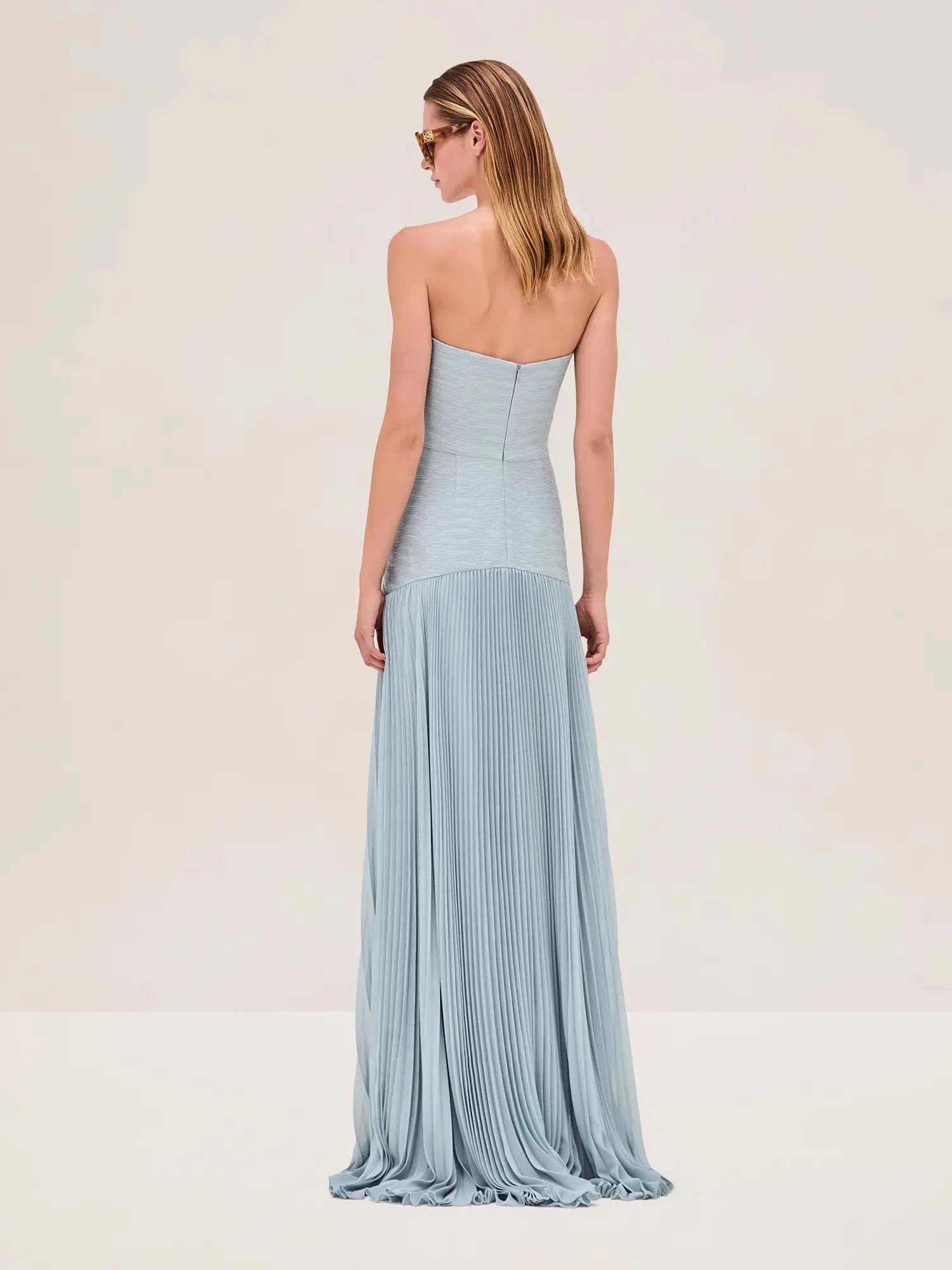 The Sunniva Dress is strapless gown with a fitted bodice and a floor-length pleated skirt.