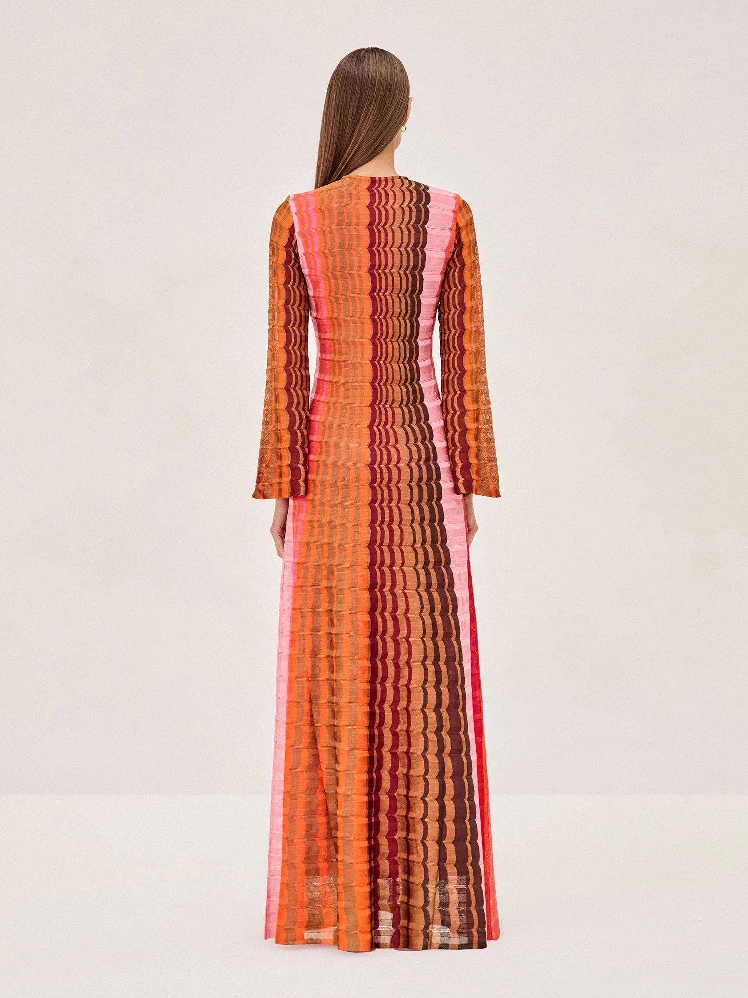 With a plunging keyhole neckline, a touch of gold hardware flared sleeves, and a wavy chromatic knit, the body kissing Vibe dress is a ’70s dream.