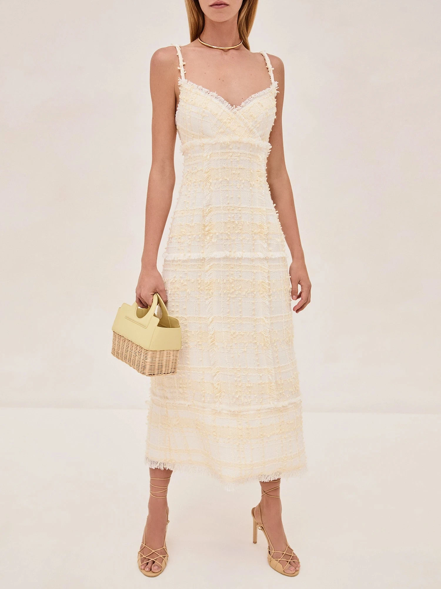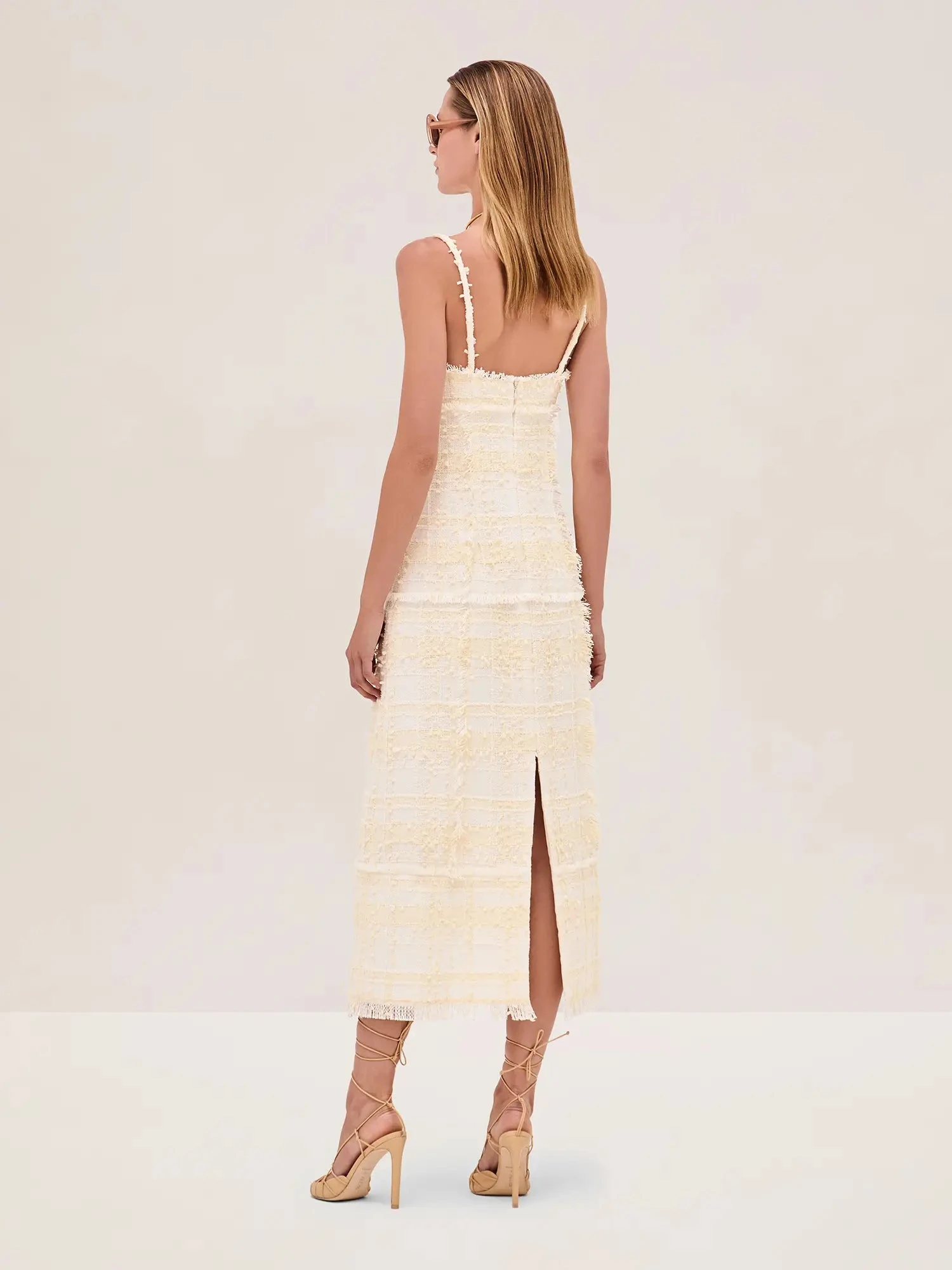 The Vicci Dress is a refined midi crafted in textured tweed with delicate straps and a flattering V-neckline. Its fringe detailing adds a touch of subtle charm, while the classic silhouette ensures versatility. Pair it with the Benning Jacket for a polished, layered look.