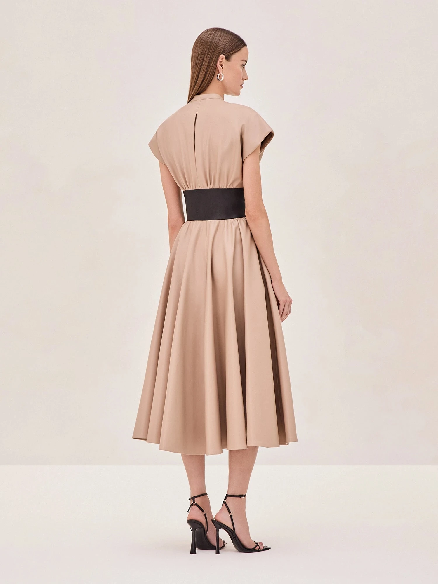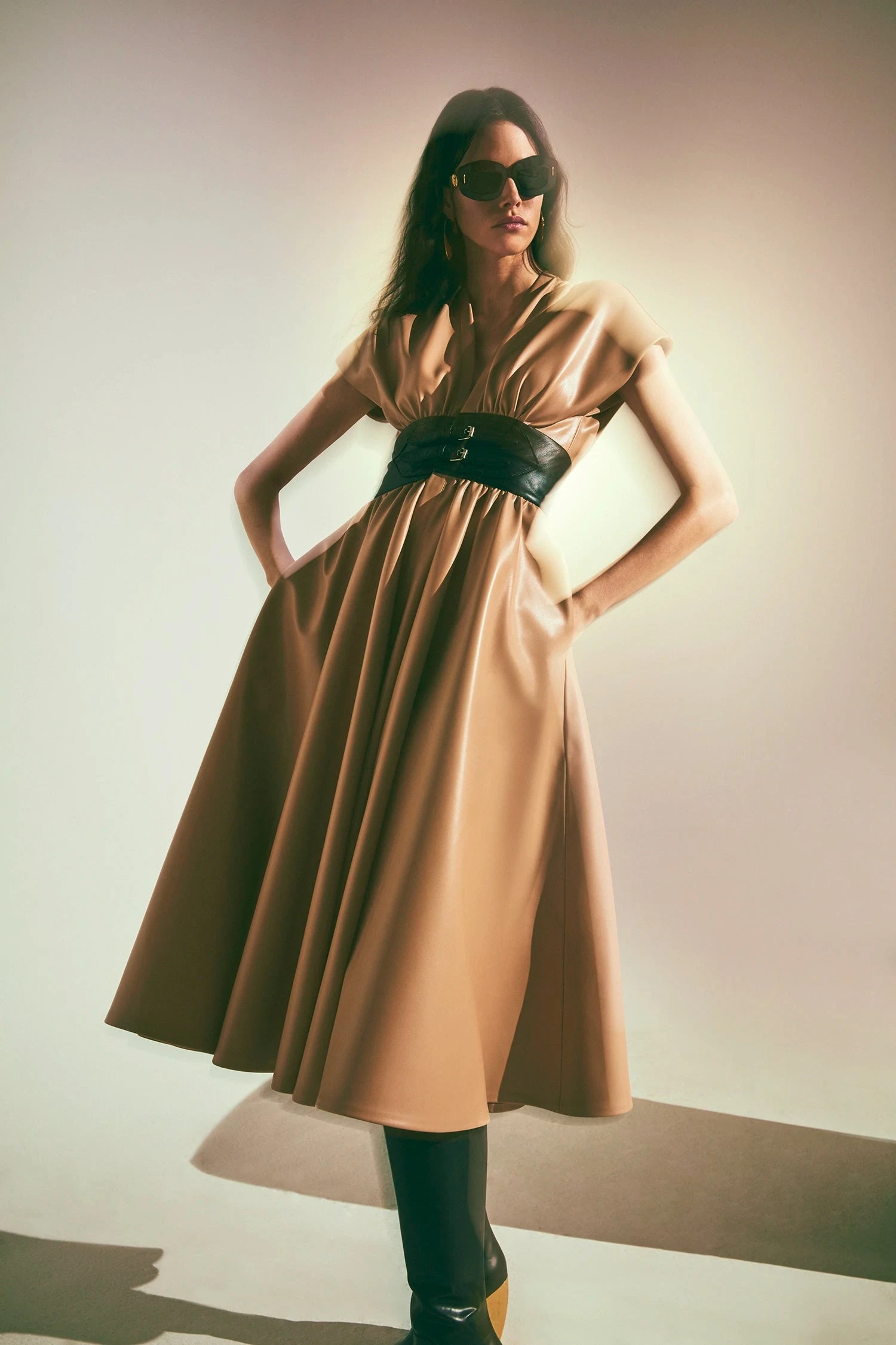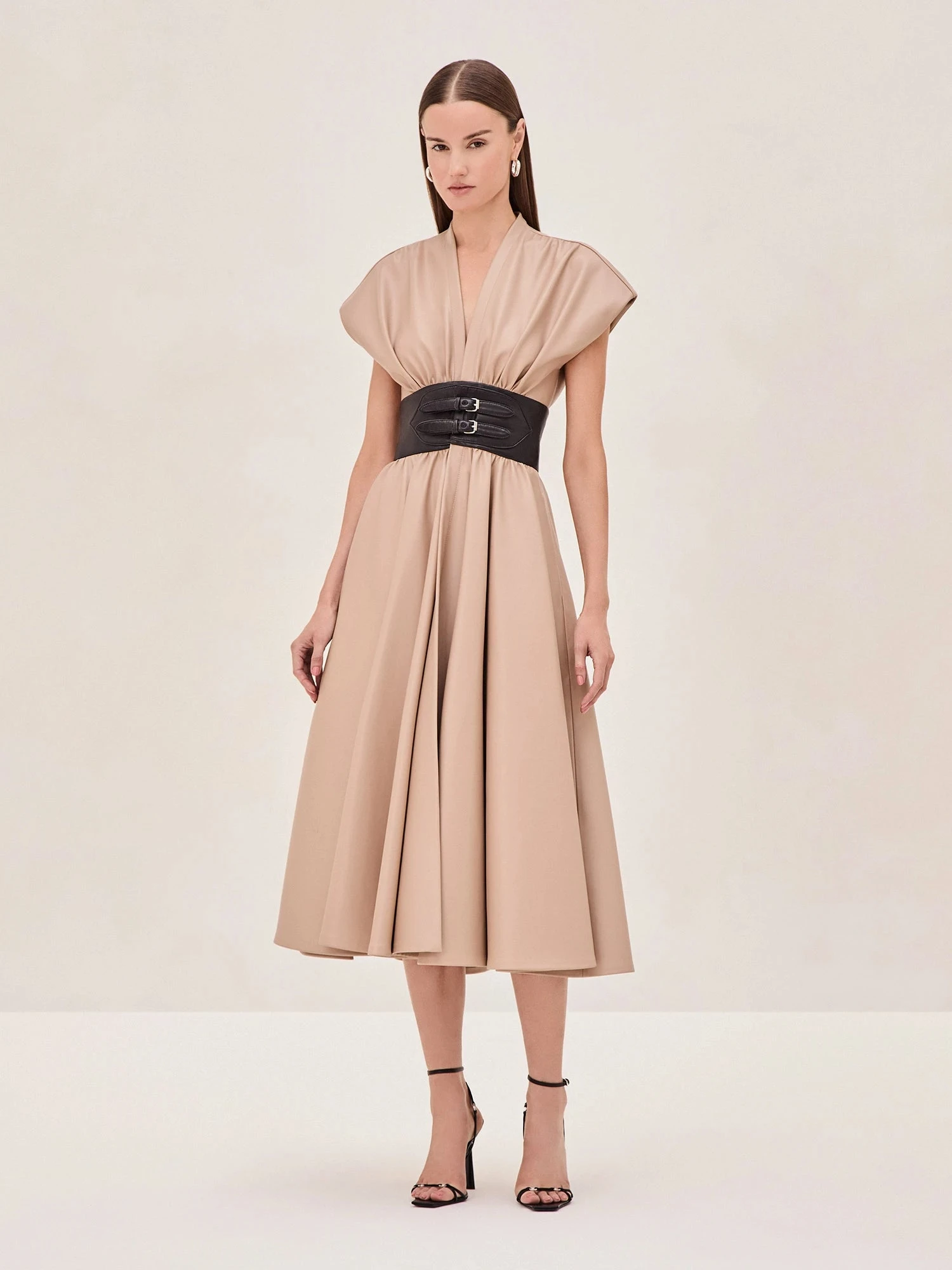 Introducing the Viktora Vegan Leather Dress. Crafted from buttery soft vegan leather, this dress features a voluminous A-line silhouette that cinches at the waist for a flattering, feminine shape. The deep V-neckline and relaxed cap sleeves offer effortless sophistication, while hidden side pockets add a functional element without compromising style.